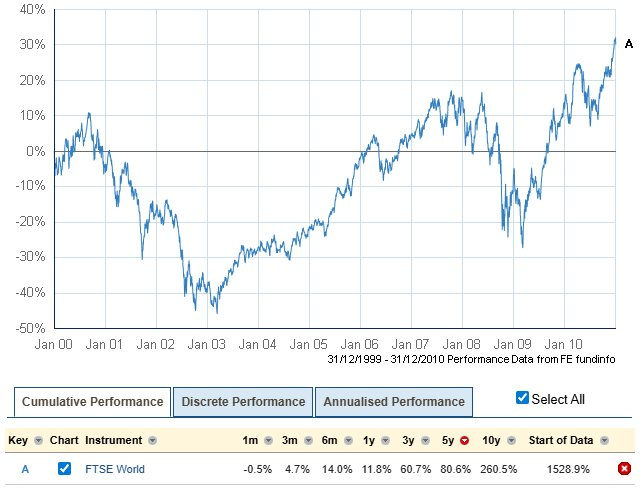 The just over 30% gain at the end is spoilt by the 23% inflation during the decade and I was paying around 0.7% pa fund manager fees at the time so even if you managed to preserve the capital the spending power wouldn't have improved - a horrible and completely lost decade for the 100% equities investor.