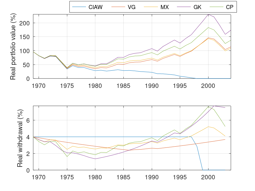An example UK retirement with a 60/40 portfolio* starting in 1969 with 5 different strategies (CIAW=constant inflation adjusted withdrawals, i.e., SWR, VG=vanguard dynamic spending strategy, MX=a 37/63 mix of CIAW and constant percentage, GK=Guyton Klinger, and CP=constant percentage of portfolio) is shown in the following graph (top panel is the real portfolio value and the lower panel the real withdrawal both expressed as a percentage of the initial portfolio).
