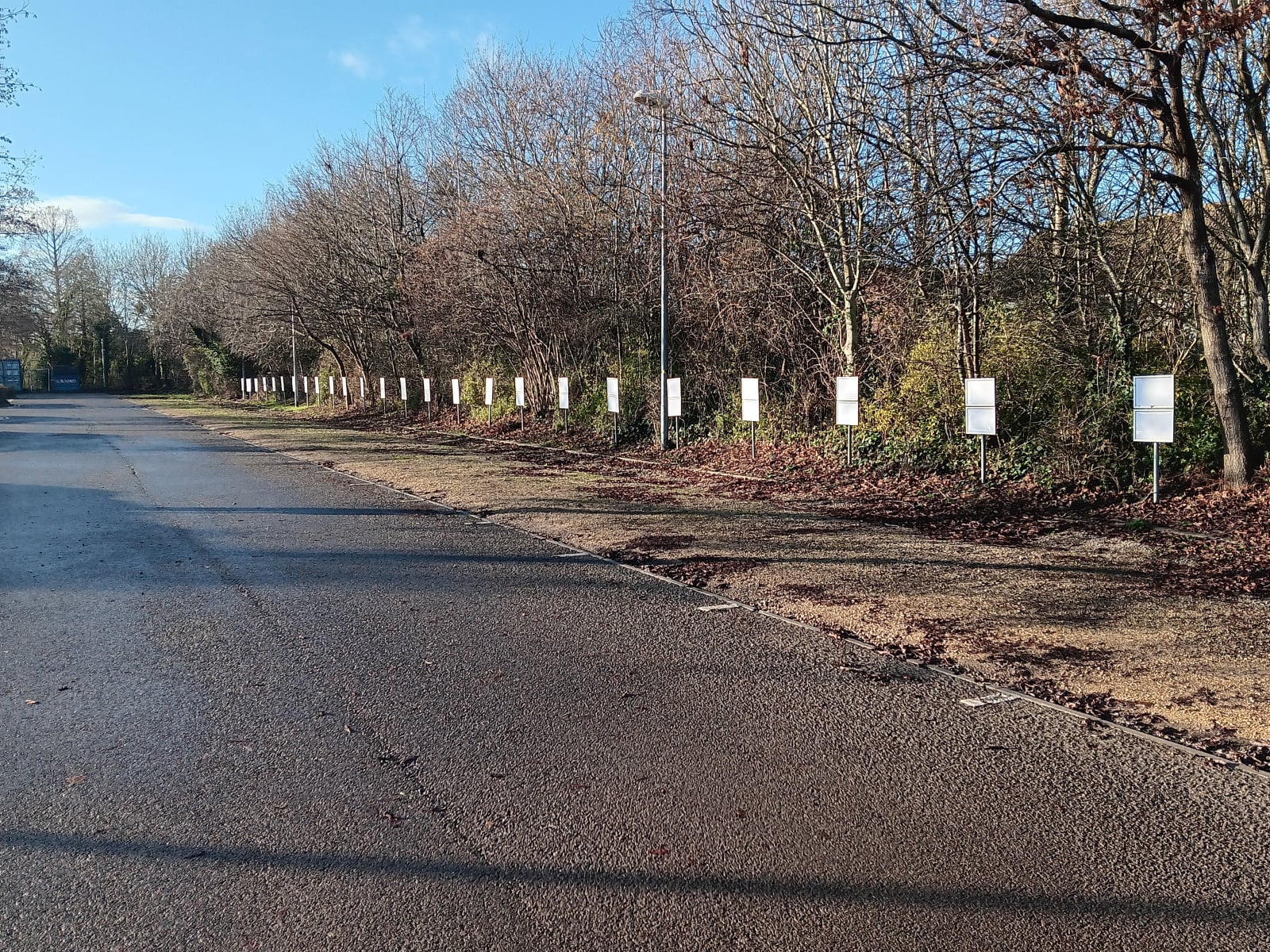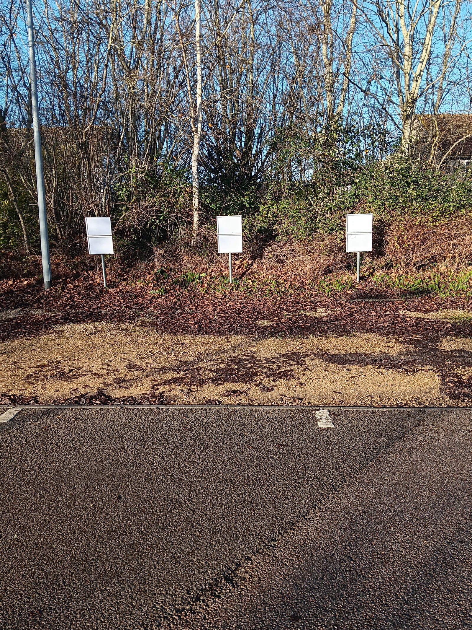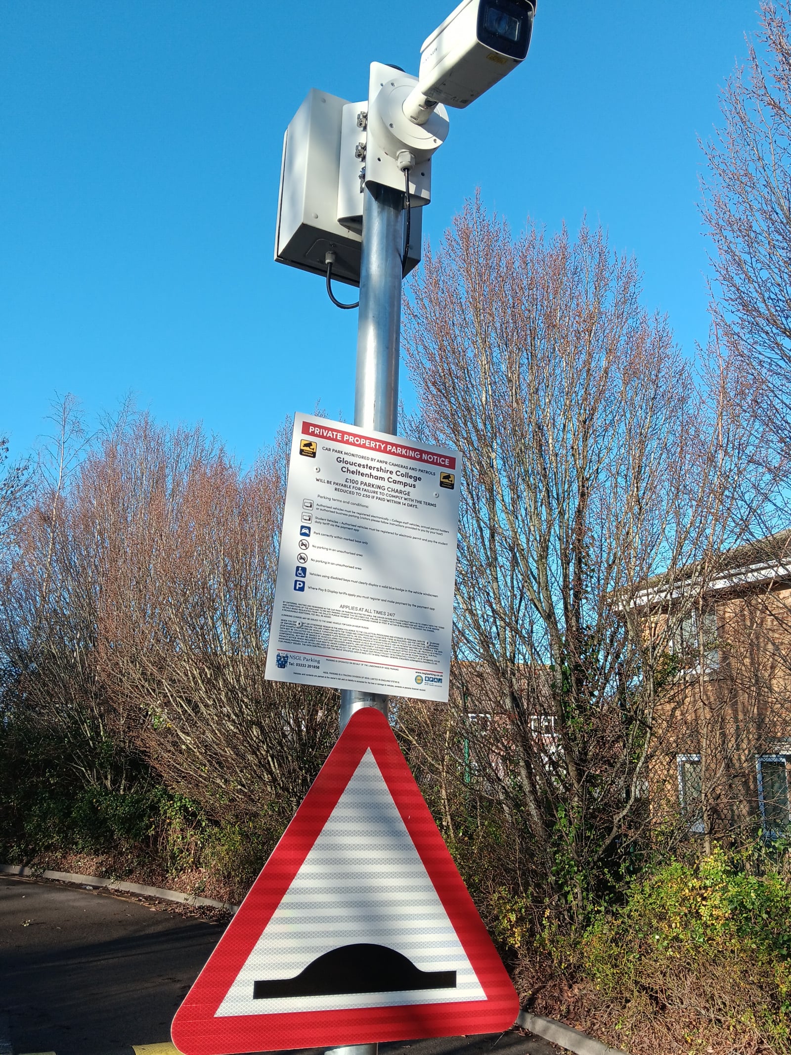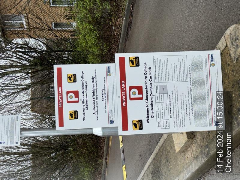 • They aren't parking signs and are completely blank, can see if you look closer at the image - sorry if not clear. Think they are used to reserve certain spaces sometimes at this particular college when there are events but nothing restricting parking/notice of charge.