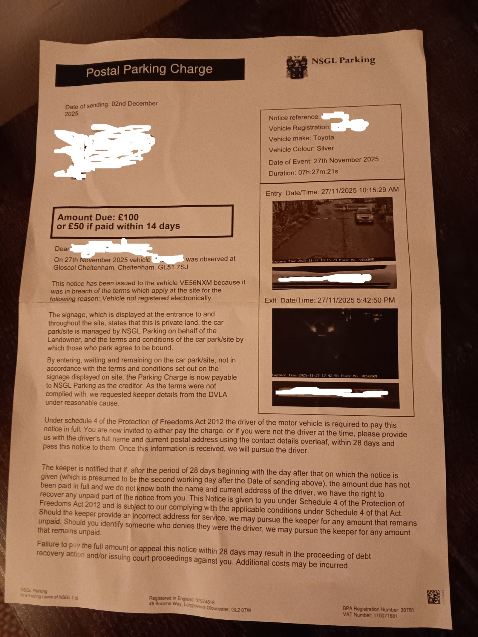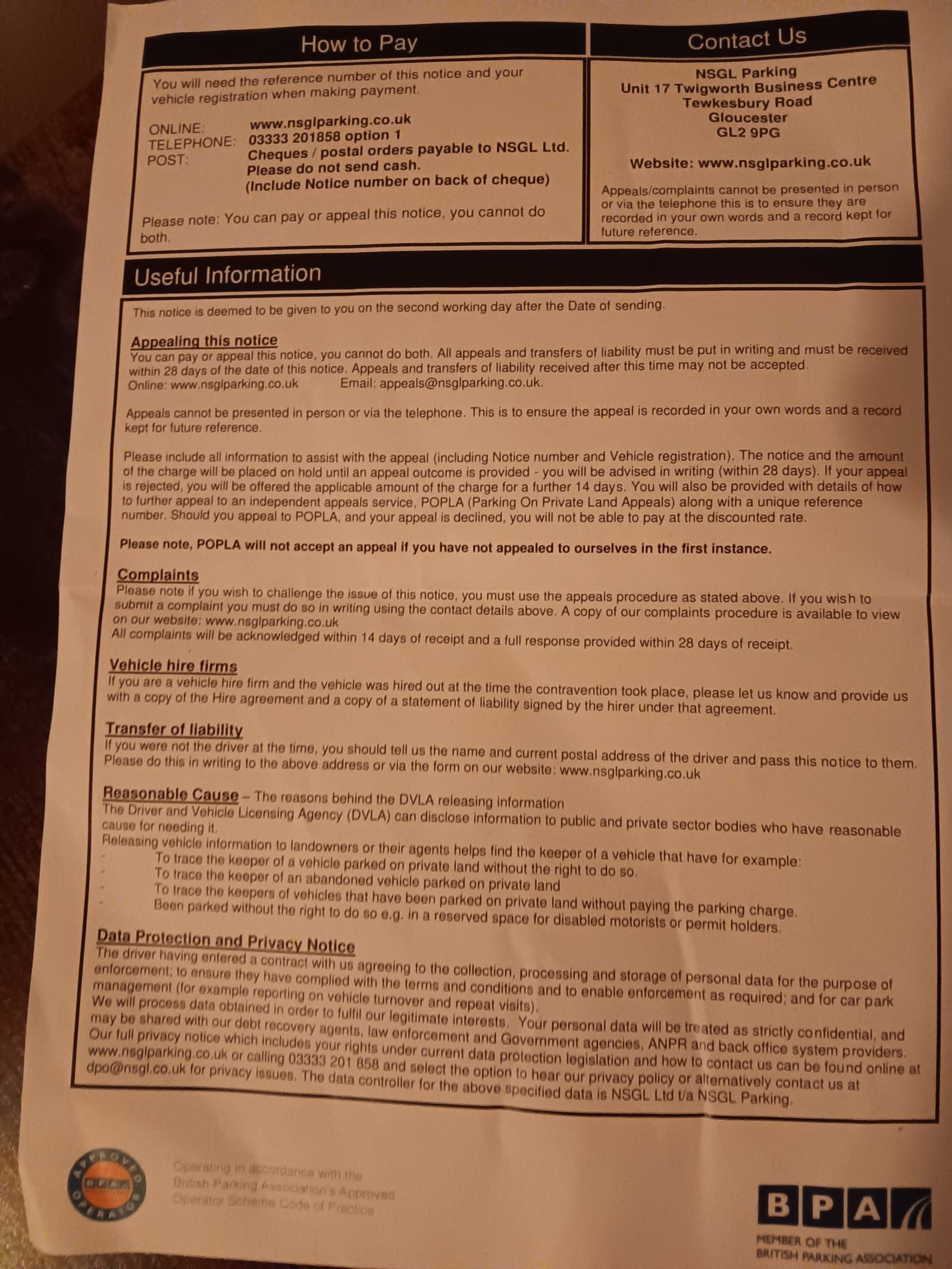 I, the registered keeper of this vehicle, received a letter dated 02/12/2025 acting as a notice to the registered keeper. My appeal to the Operator – NSGL Parking – was submitted and acknowledged by the Operator on 09/12/25 and rejected via an email dated 15/12/25. I contend that I, as the keeper, am not liable for the alleged parking charge and wish to appeal against it on the following grounds: