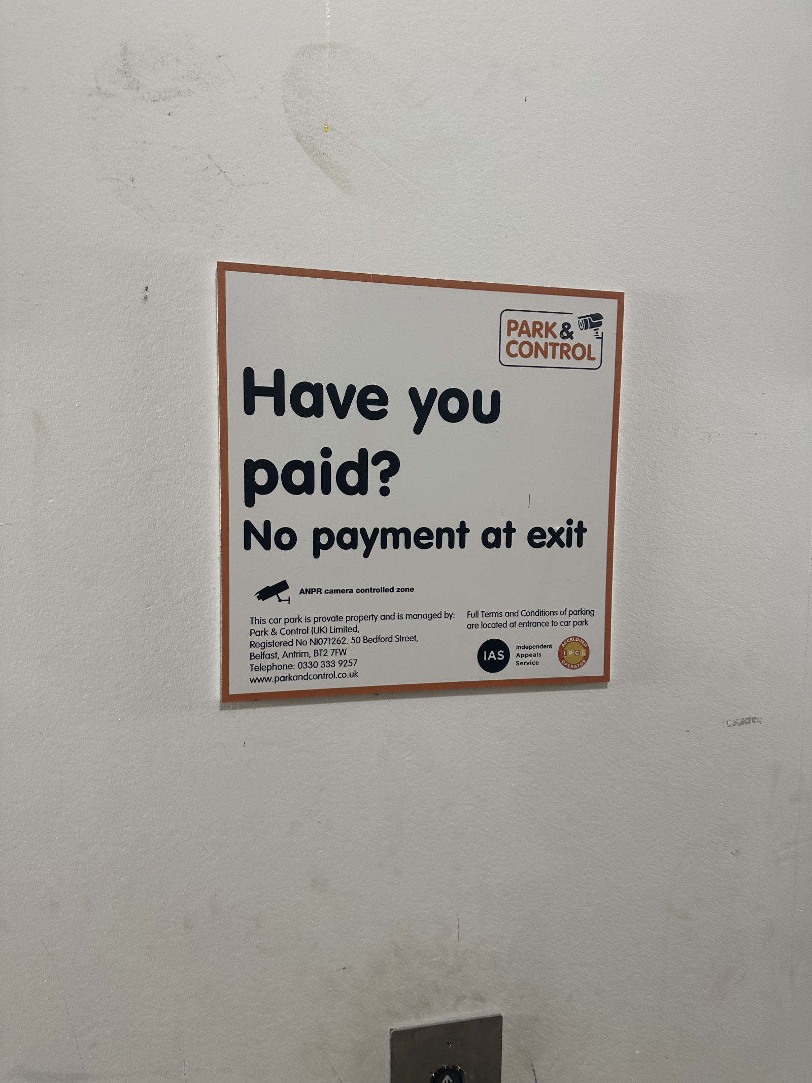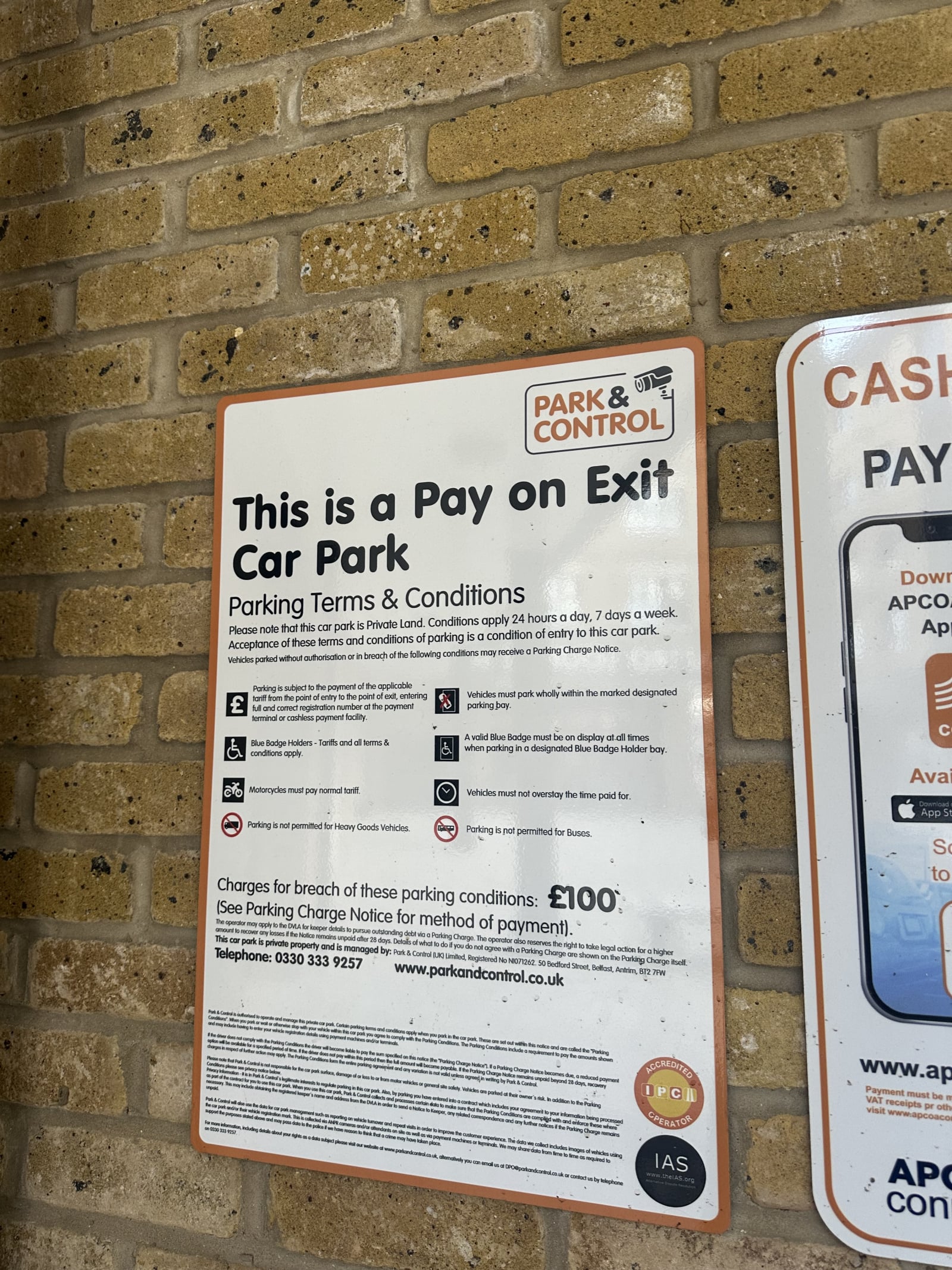 There were two signs, one saying "this is a pay at exit" and the other saying "this is not at pay at exit" car park.