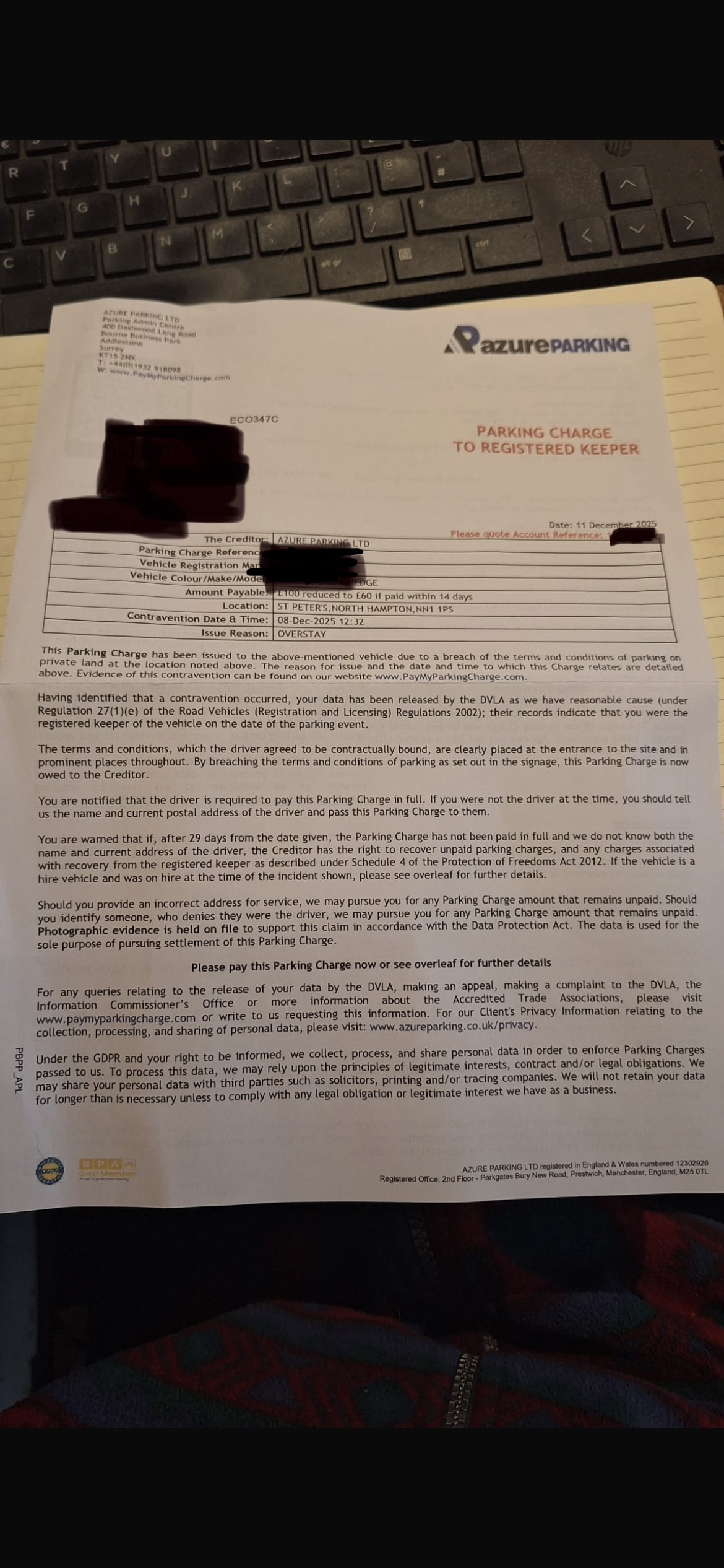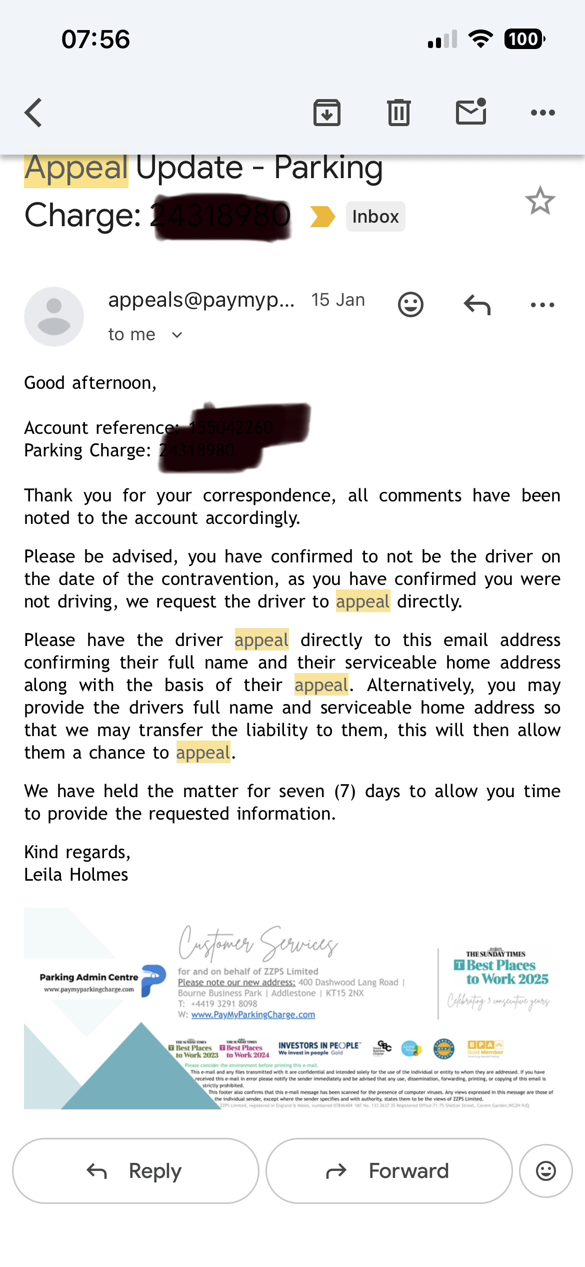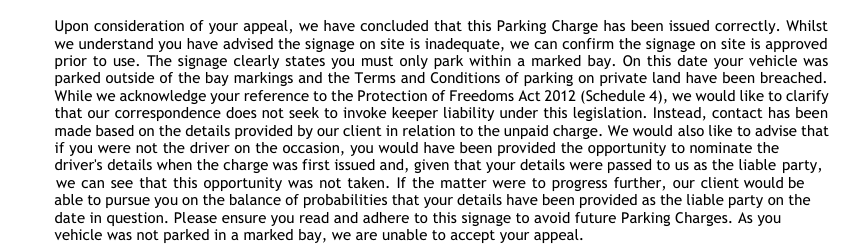 Thank you for your correspondence.We have received your appeal as the Registered Keeper. Please be advised, the contravention was on 05/12/2025 and we had sent the Parking Charge on 16/12/2025 therefore, the Parking Charge does comply with the Protection of Freedoms Act (PoFA) 2012 as the initial notification of the Parking Charge was sent within 14 days of the contravention. Whilst we do not dispute what you have or have not received and in what timeframe, the progression of the matter begins from the day the Parking Charge is sent. Due to this, we would require the driver to appeal the issuing of the Parking Charge, in the absence of an appeal within the twenty-eight (28) day timeframe the registered keeper will remain liable for this matter.Whilst we understand you state the signage is not clear, we can confirm the signage on is approved by the British Parking Association prior to use. It is sufficient in notifying motorists that when parking on site the vehicle must be in a designated bay.We note you state that there is no evidence of a breach of the terms and conditions on site. However please note that our client maintains that the photographic evidence ( Available on our website www.paymyparkingcharge.com) is sufficient in showcasing a breach of the terms and conditions for parking on site.As you have confirmed not to be the driver on the day, please either provide the drivers full name and serviceable address within seven (7) days of the date of this email so we m ay give them the opportunity to appeal or make payment. Alternatively, please request the driver appeals directly to appeals@paymyparkingcharge.com. Within this email they will need to confirm their full name, serviceable address and confirmation that they were the driver on the day.As per the Single Code of Practice, Annex C, the driver is often the same person as the keeper and/or the hirer. Where a keeper or hirer fails or refuses to provide the name and serviceable address of the driver when requested to, it may be assumed they are the driver, based on that failure or refusal. In absence of driver details, you as the registered keeper can therefore be assumed to be the driver.We have placed the account on hold for seven days. The options available are to provide driver details, appeal the issuing of the Charge and outline the reasons you believe a Charge should not have been issued, or make payment.Kind regardsJohn brown.