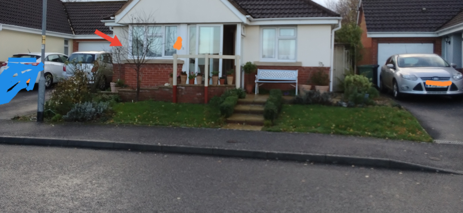 Blue is where he parks, red arrow side window.
