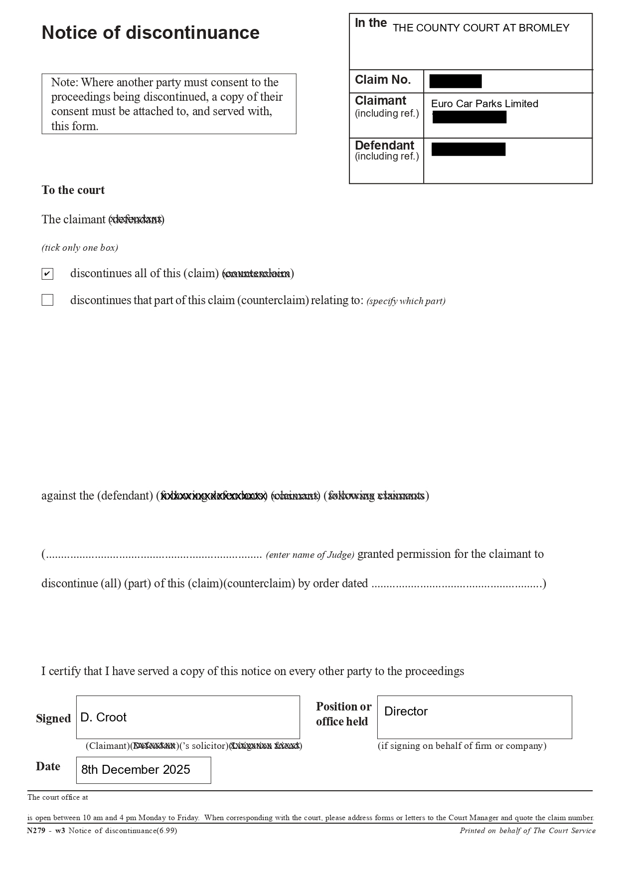 N279 Notice of Discontinuance: 8th December 2025 (deadline for claimant to pay court fee was in mid December)