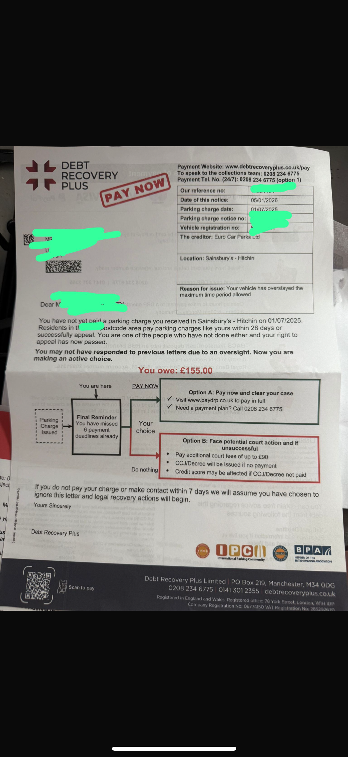 Sainsbury’s in Hitchin - when we went in to the store, they said the car park was managed by an external parking company and they could not do anything about wavering the original charge/letter, even though we had been in store on the day and had three children <3yrs old with us, on one of the hottest days of the yearHalf_way said:Scaremongering nonsense designed to deceive.