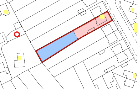 This is the title plan showing the pink and blue areas of the garden - the yellow is just me blocking out house numbers - where I have put the red circle is a piece of land where there seems to be something related to the water company as per pictures - so could it be there is some kind of covenant stating that that piece of land can not be turned into an access road? We have very long gardens, in excess of 200ft so I expect people have had the idea of of selling off some of there land to a house builder but can't