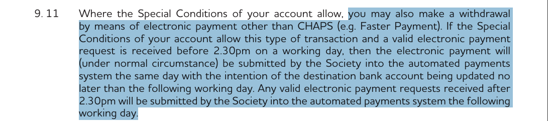 I can only really go off Mansfield's General Ts&Cs, whenever I've made deposits into them I've typically done this early in the day on working days.nottsphil said:Thanks for posting those excerpts Brid. I'm going to put them in an email to the Mansfield along with a photo of a passbook I will get updated following a 4pm faster payment that I'll make next Friday. I just don't believe they backdate the interest for FPs that they manually post the following working day!
