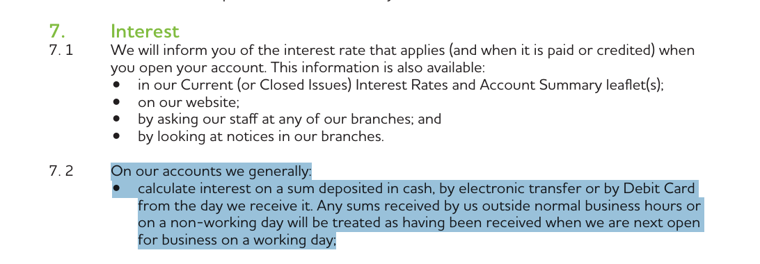 Thanks for posting those excerpts Brid. I'm going to put them in an email to the Mansfield along with a photo of a passbook I will get updated following a 4pm faster payment that I'll make next Friday. I just don't believe they backdate the interest for FPs that they manually post the following working day!