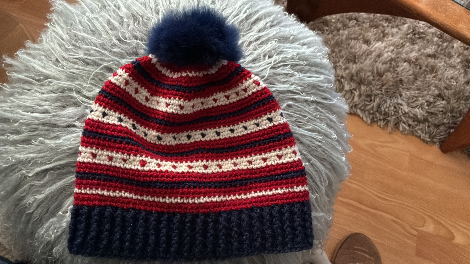 One x 100g ball of light blue wool to declare. Plus 50g of red wool. I have made five hats. The rest were all made from old stash. Three will be presents. Two are for me to wear.My DH didn't want a floppy hat or one with a Pom Pom so I made him a Fisherman's beanie.