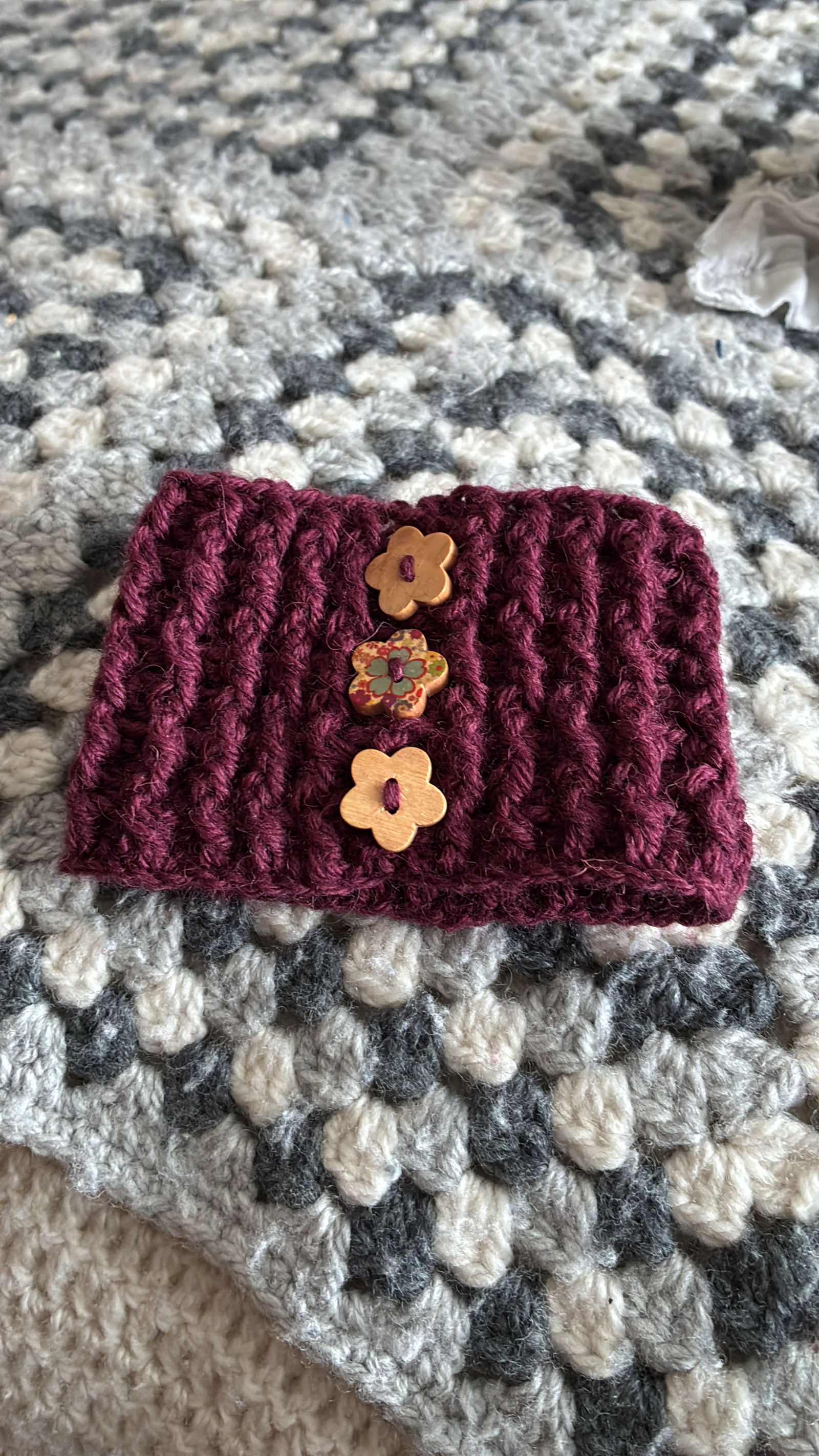 Tonight I tidied my scarves, hat and gloves. I came across a headband that I crocheted with some leftover wool that is too big. I'm going to undo it and turn it into two cup cosies. I was also thinking about undoing and turning my mittens that I made into hand warmers as the are also too large. I don't want to waste the wool.