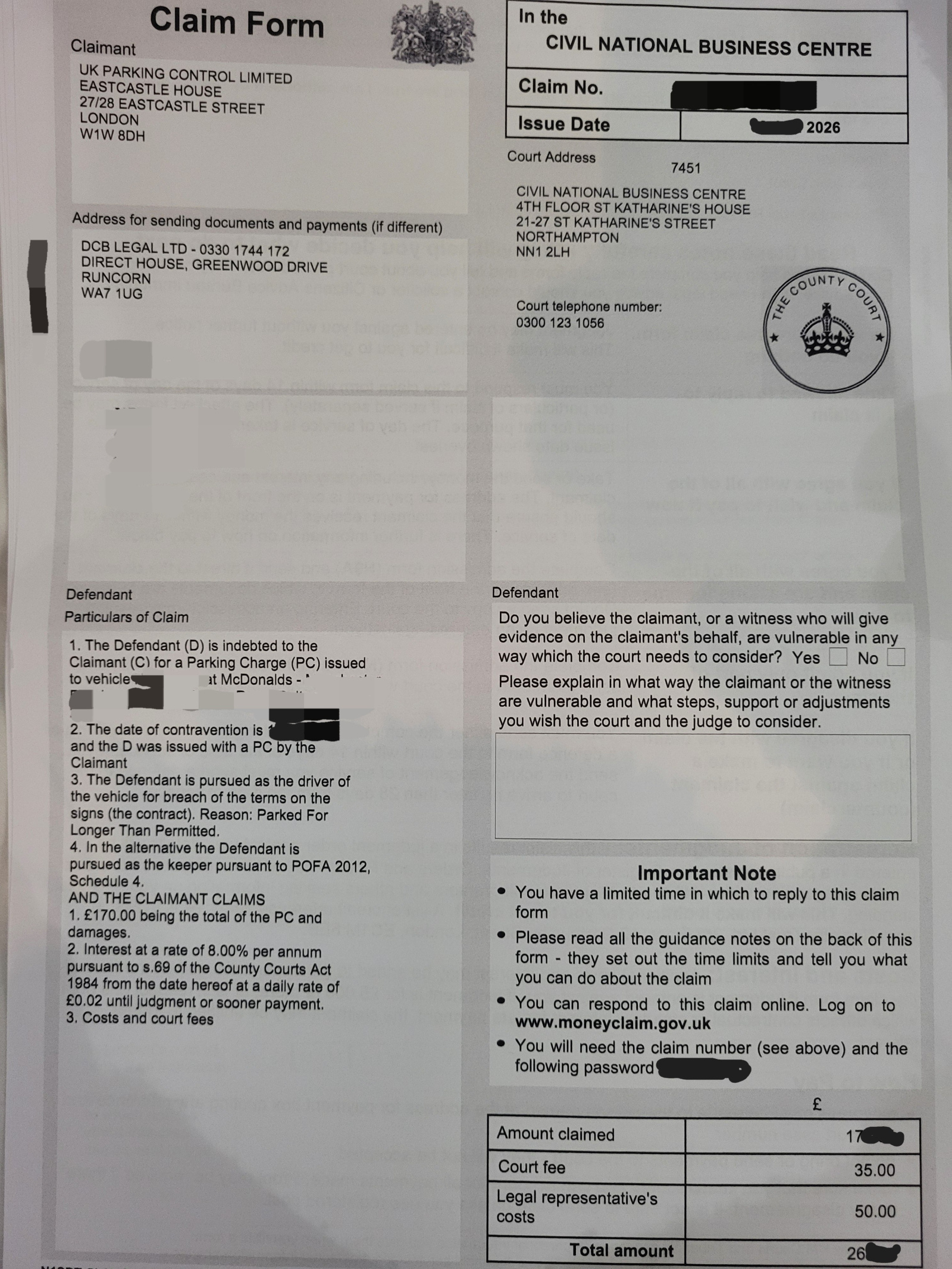 I have just received the LoC for the overstay on McDonalds parking. Fortunately/unfortunately all previous correspondence from UKPC/ debt collectors (?)/other solicitors companies were ignored.
