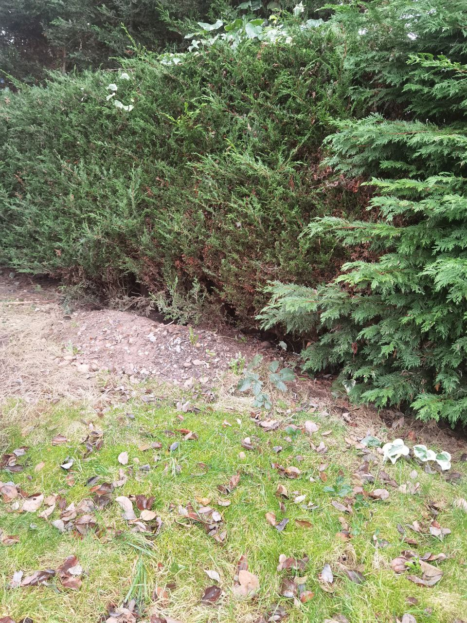as they have nowhere to hide. Further to that, a local family of badgers seem to have moved into our little town and decided that our garden is nice place for their set entrance. On the other side they seem to arrange a path under the fence, so there is a characteristic hole underneath. I am somewhat concerned that the house is likely to be difficult to sell now - although the entrance is hidden under the hedgerow it is still quite visible. I am hoping they will not damage the trees forming the hedge...