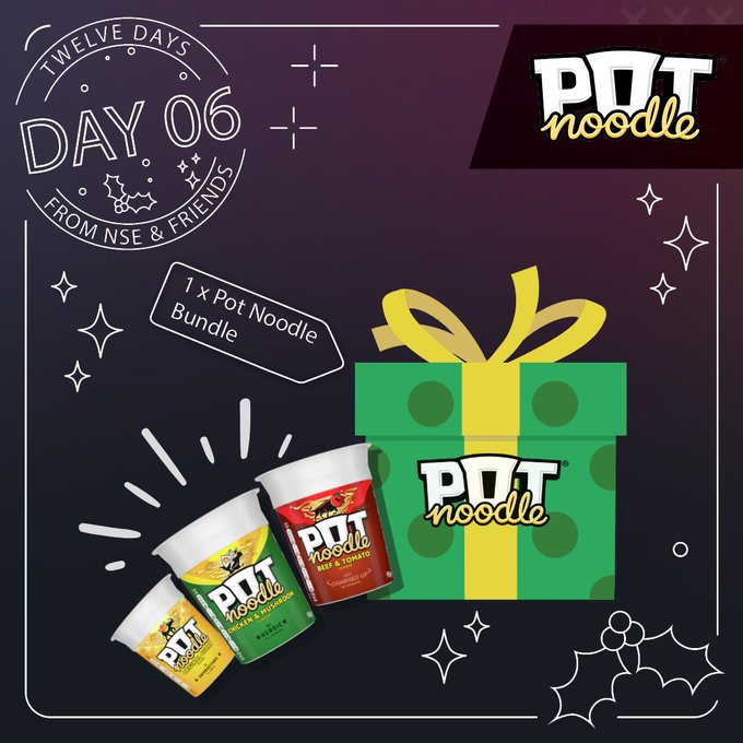 Day 6: https://x.com/nse_gg/status/2005989945790369833On the sixth day of Christmas, NSE gave to me...🎁 1x Pot Noodle Bundle!💚Courtesy of our lovely partners Pot Noodle!✍️To enter, fill in the blank "A Pot Noodle is best enjoyed when ___" below by 10:00am tomorrow(31/12). UK only. Must be following @nse_gg and @PotNoodle
