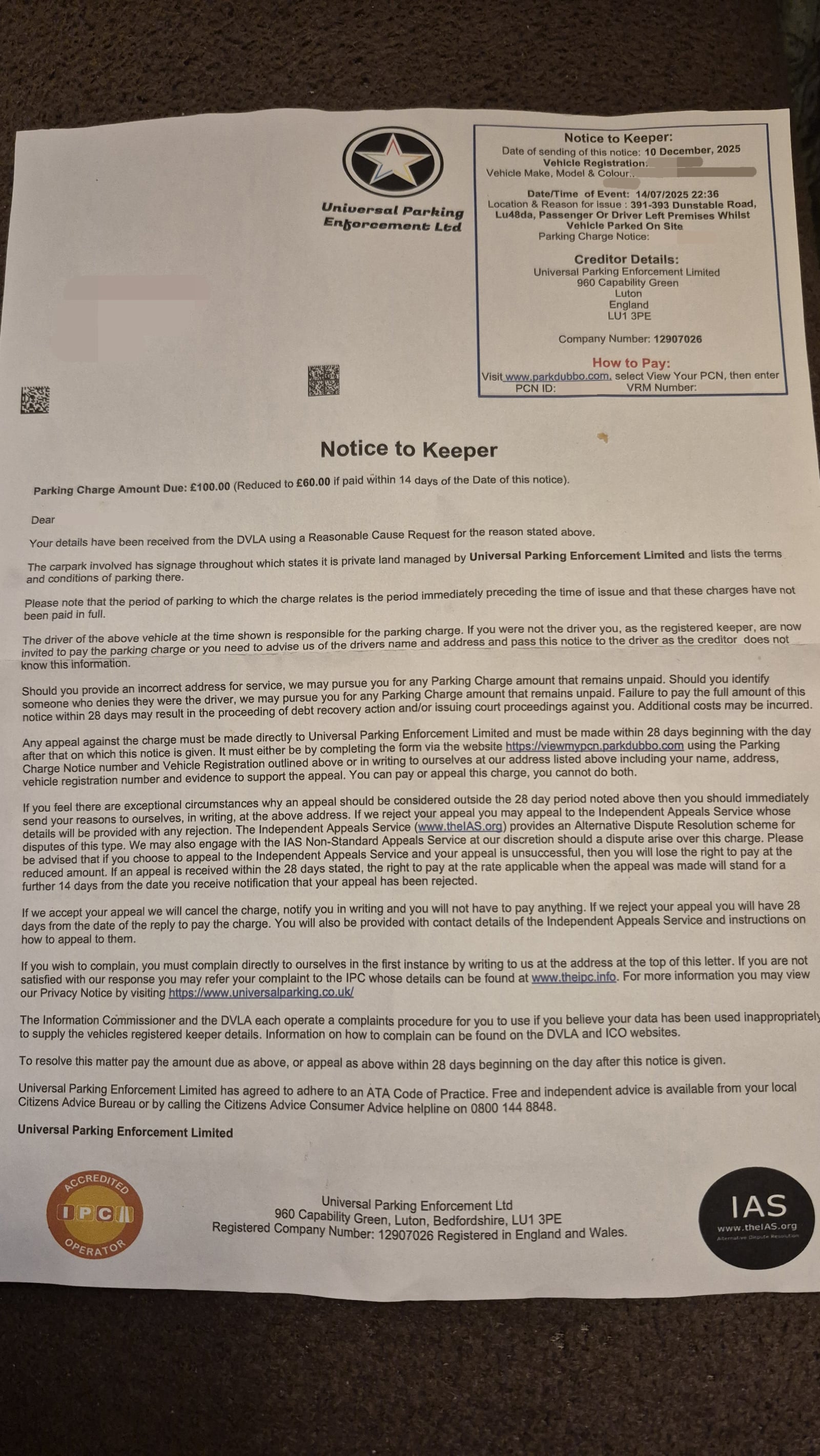 5 months later on 17th December 2025 he received the NTK from Universal Parking Enforement asking for £100, reduced to £60 if paid now and decided to appeal it which got rejected. Now they have said he can appeal to IAS within 21 days or pay the £60 by the 05/01/26.