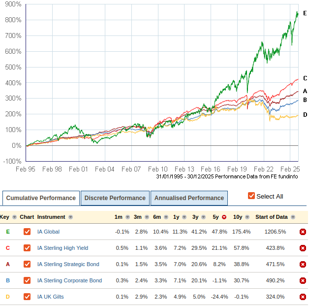 You have about 20 years from 1995 where there really isn't a huge difference between the total return from global equities and various flavours of bonds. You might say that bonds got a boost from the low interest rate era from 2008-2022, but even going into the GFC, equities had zigzagged through the dotcom crash while bonds were relatively unaffected. You can see the effect of interest rate policy on the gilts line, which if you extrapolate the 1995-2007 trend, it almost joins up with where we are today.You can see clearly from the last few years that the riskier bond sectors have really taken off. I doubt the post-2022 trend or 6-9%pa is sustainable, but with the benefit of hindsight junk has been kind to investors of late, despite tightish spreads. I see certain strategic funds are starting to load up on gilts again, so make of that what you will.2 -