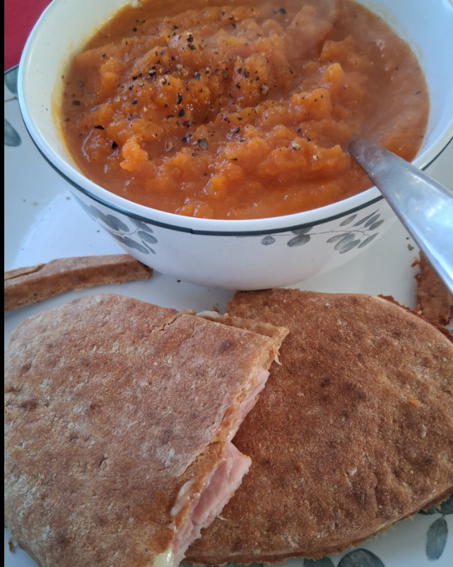 Carrot and coriander soup, pure speed, ham and cheese toastie, hexb and half hexa