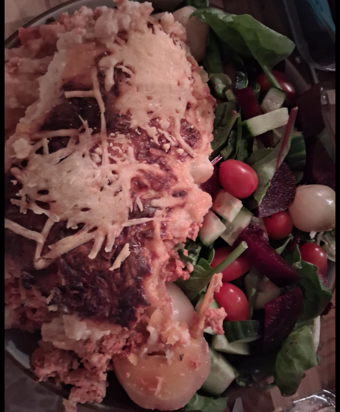 Lasagne, BNS as layers , not pasta, white sauce made with cauliflower and cheese spread, 1 hexa with cheese on top.