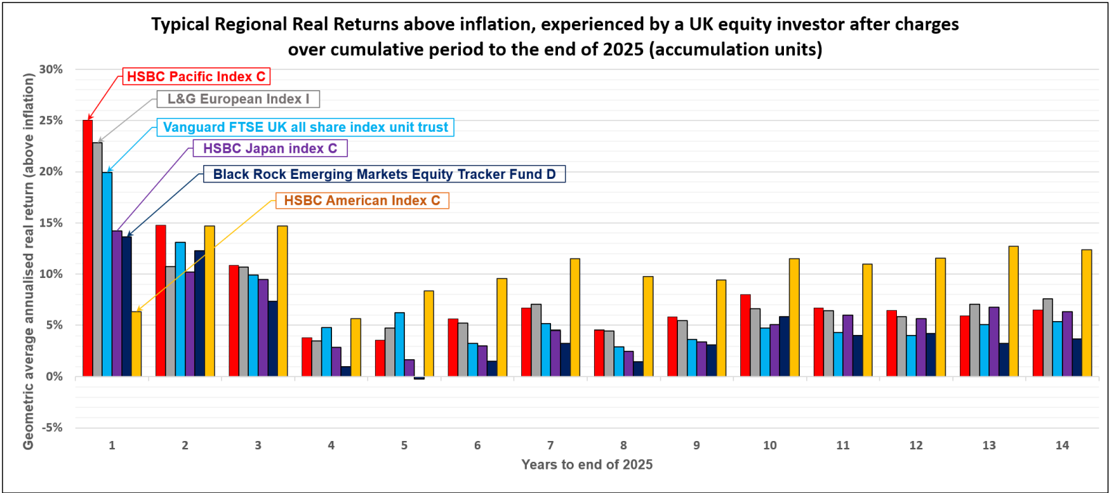 This is what regional real returns (over UK CPI inflation and after charges) for a UK investor look like based on cumulative performance of various geographic trackers, assuming I've not made any mistakes