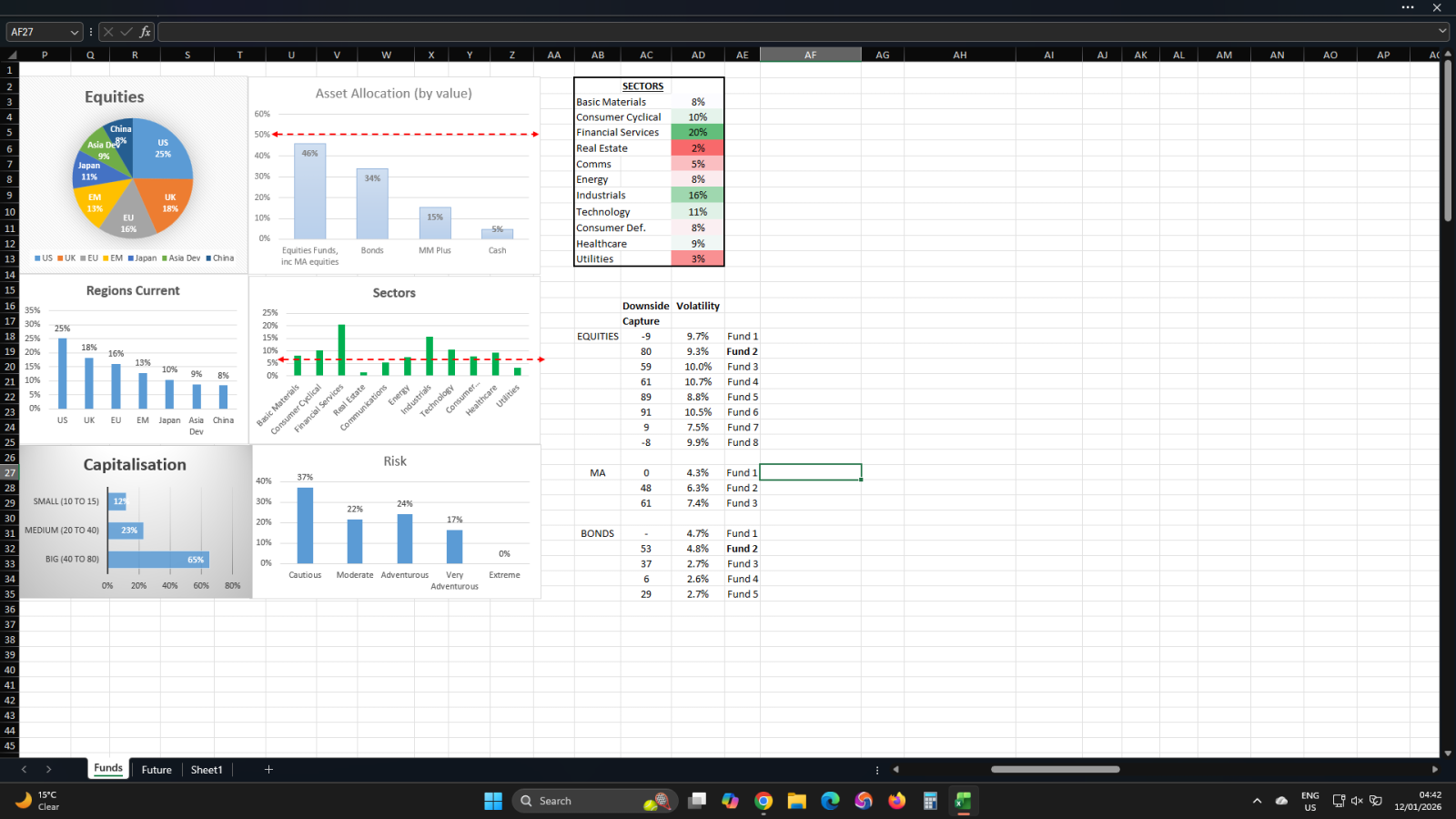 Note: not all the charts carried accross correctly because I had to dissassociate it from my data. I track regions for equities and also for currencies. And the apparent duplication of sector reporting results from a model I have set up which shows the before and after effect of fund changes....you get the idea that it's important to keep an eye on the metrics and observe changes.