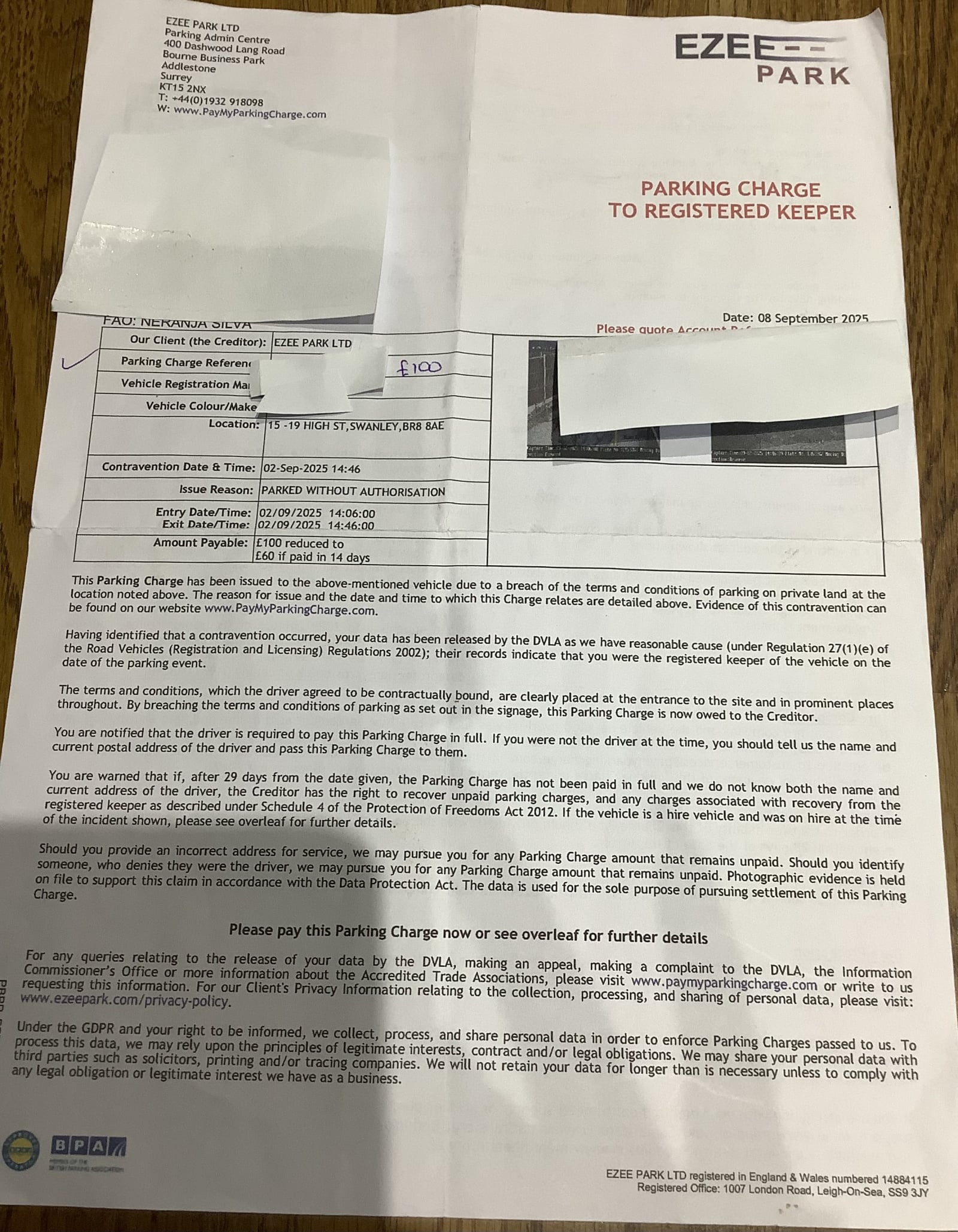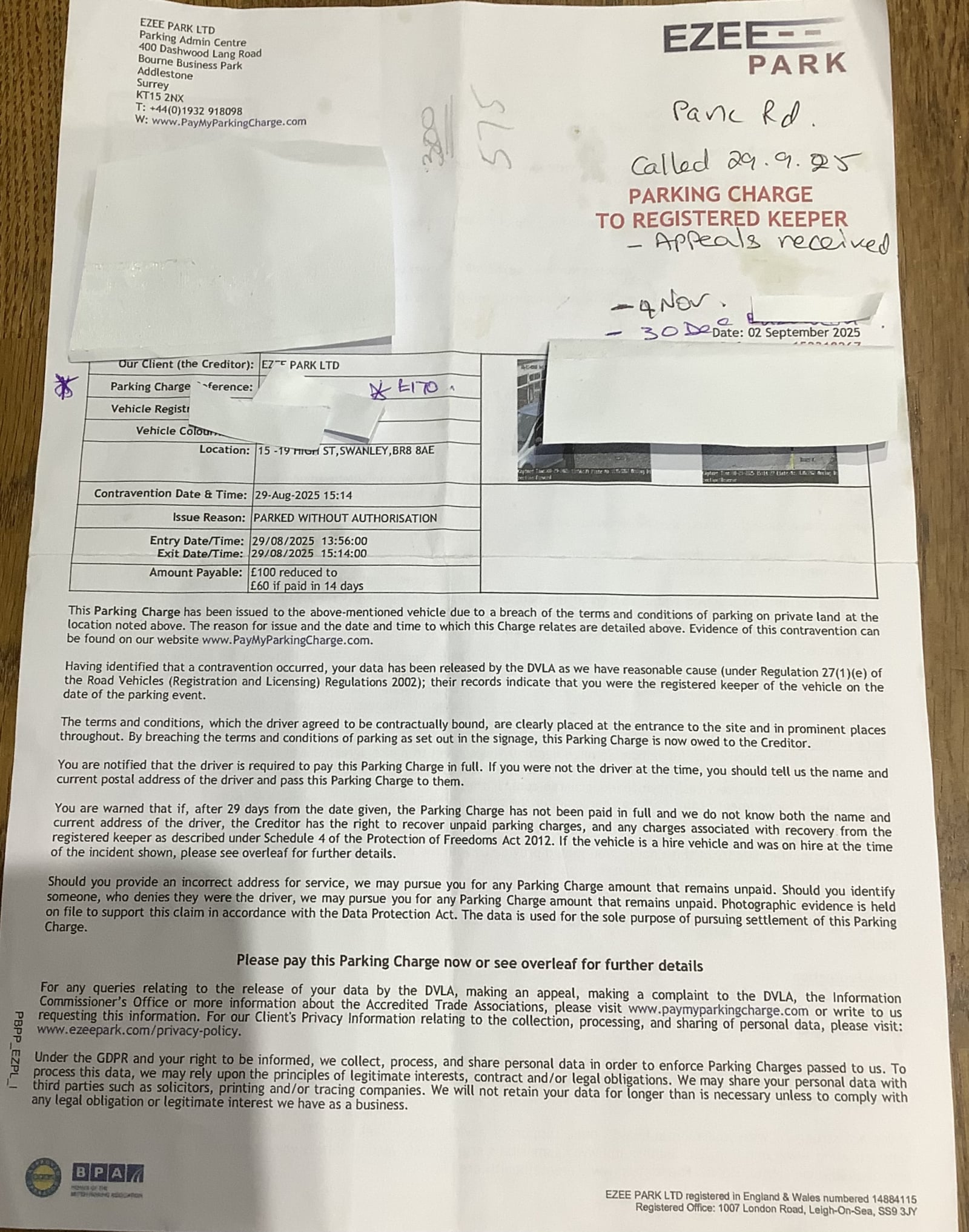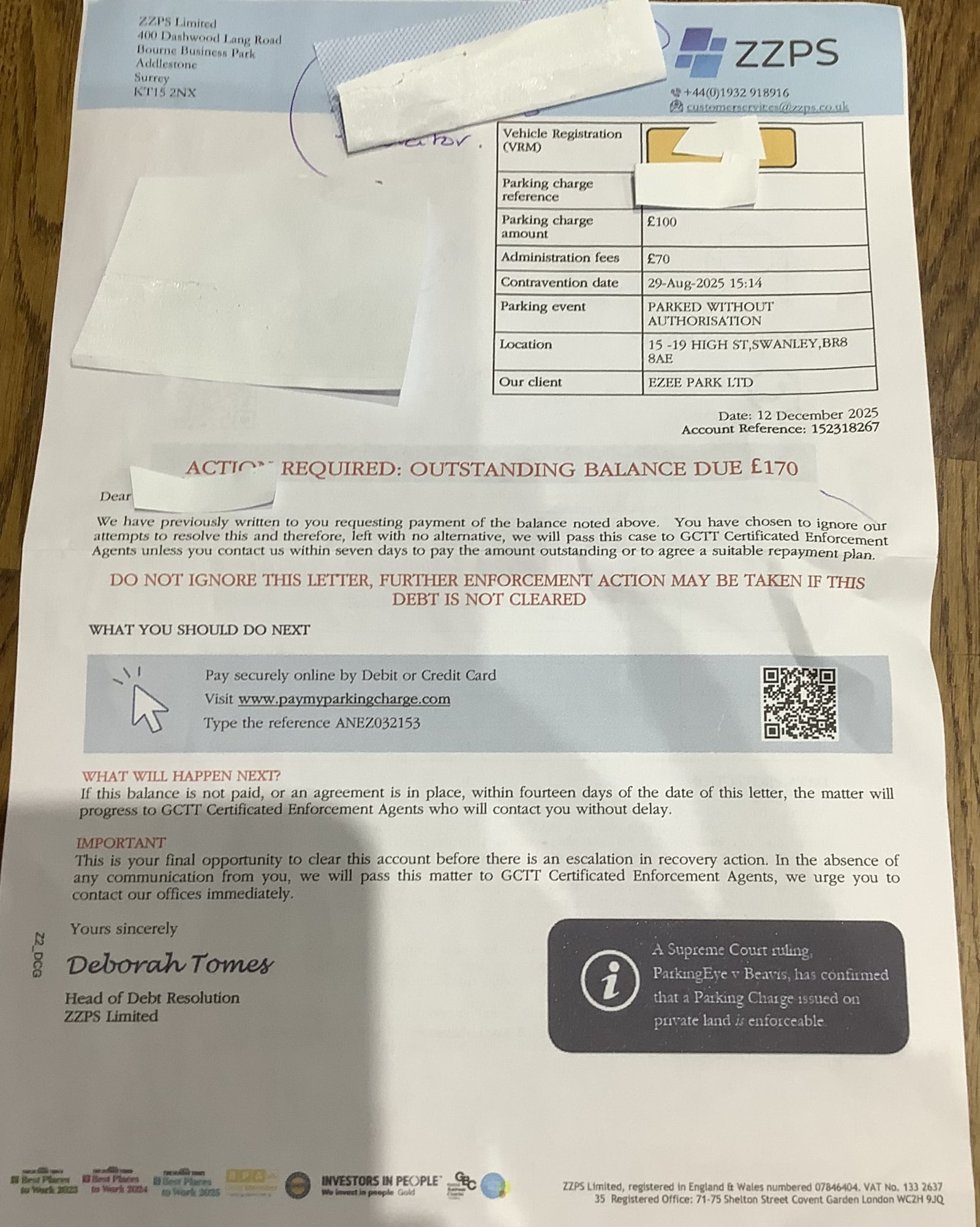 30.12.25 : I spoke with 2 staff - (one staff from Ezee Park and other from ZZPS) upon opening the ZZPS letter of 12.12.25. (Due to declining health issues I have been recuperating at my mum’s for some weeks and therefore not at home to receive this letter). On that call I was advised a letter from their enforcement agents, GCTT Certified Enforcement Agents has been issued on 30.12.25. (Not yet received).
