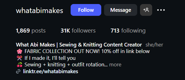 This is what her Bio says and she has a post about knitting so I think it could be that.