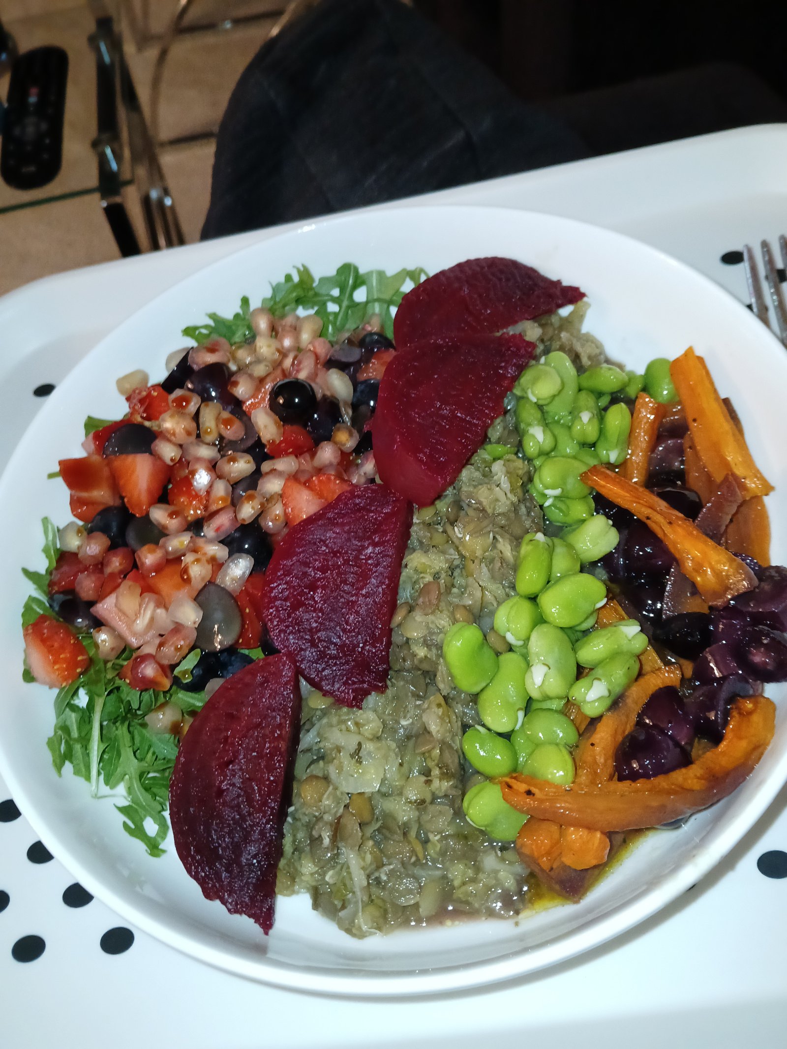 Dinner tonight is going to be green lentils with savoy cabbage, roasted carrots and black grapes in a maple balsamic dressing, broad beans, steamed beetroot and coriander buckwheat. I'm looking forward to it - I'll probably add some rocket and berries to my plate too - I'm still craving salad!!