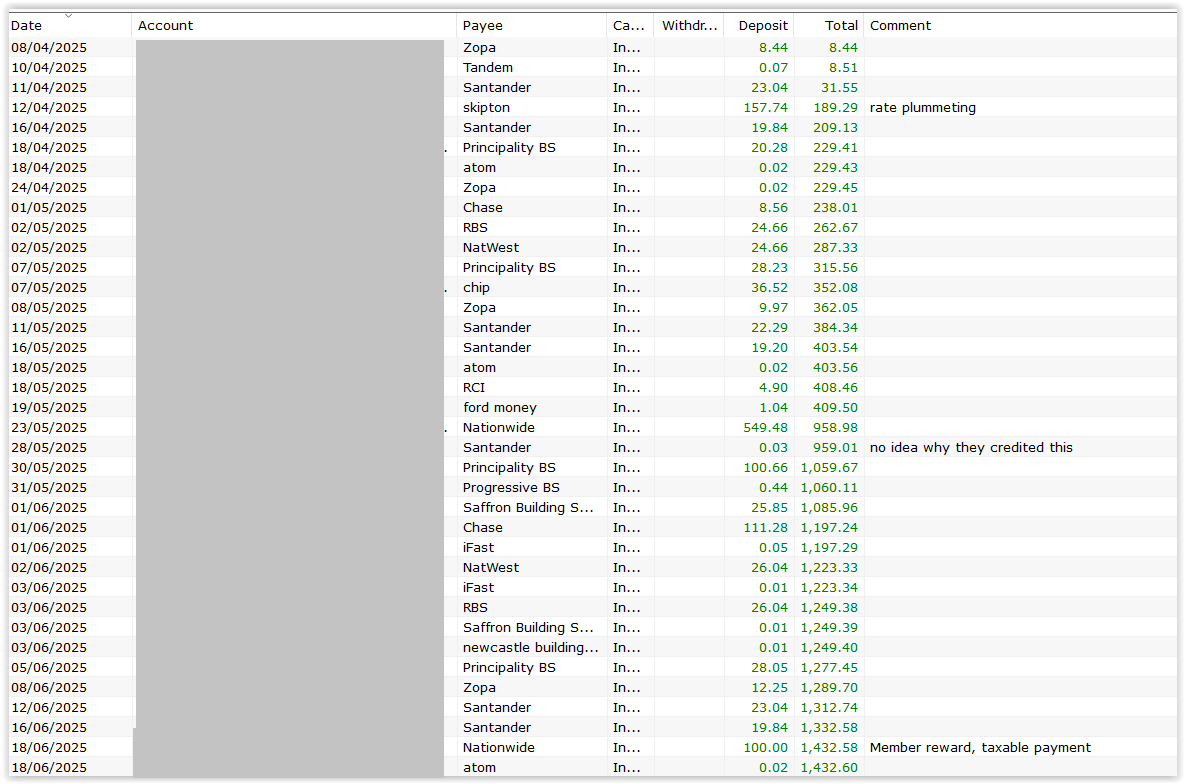 What it (or rather I) doesn't do is record individual payments of interest on those accounts that earn it, something I wish to start capturing.