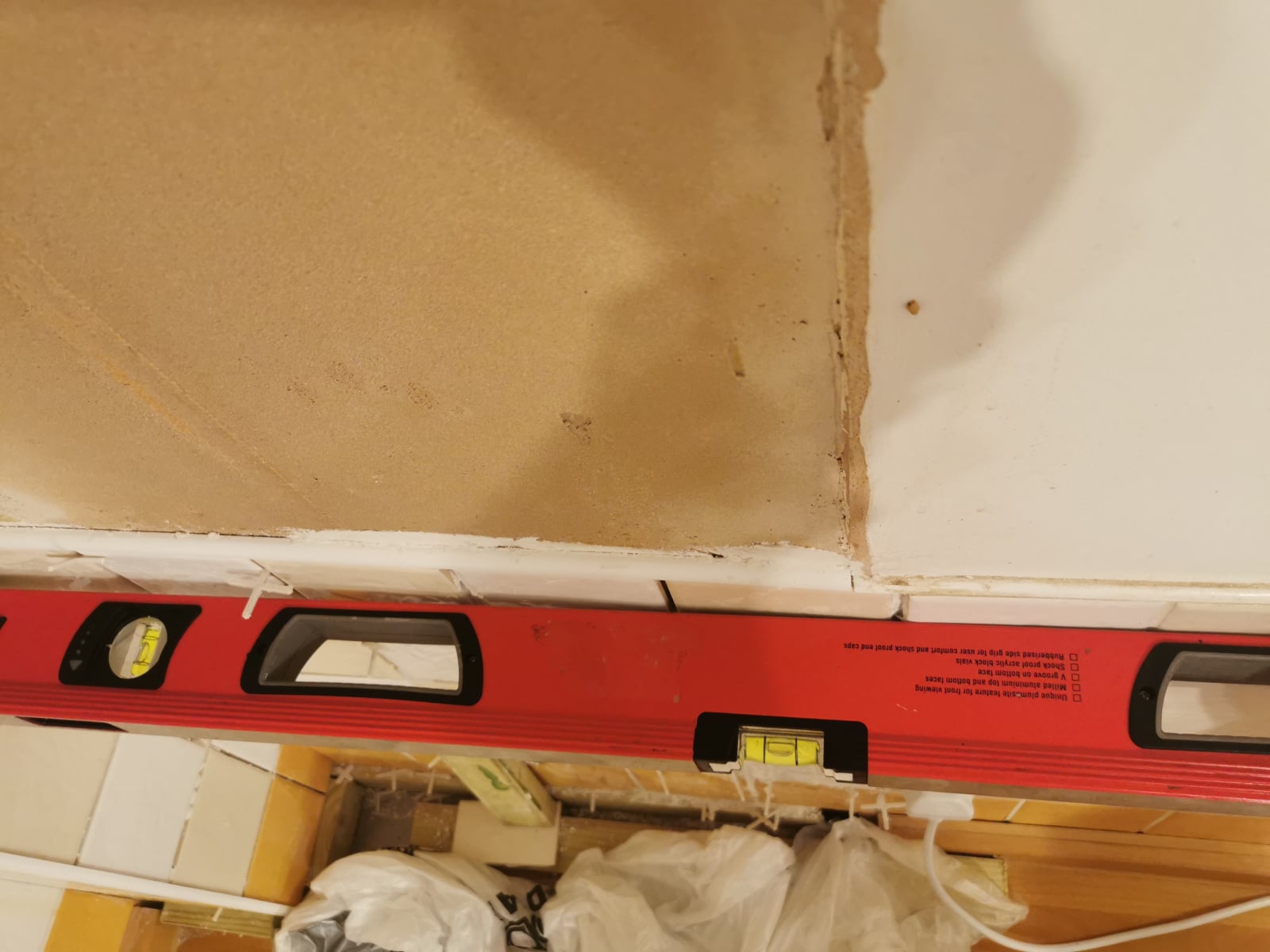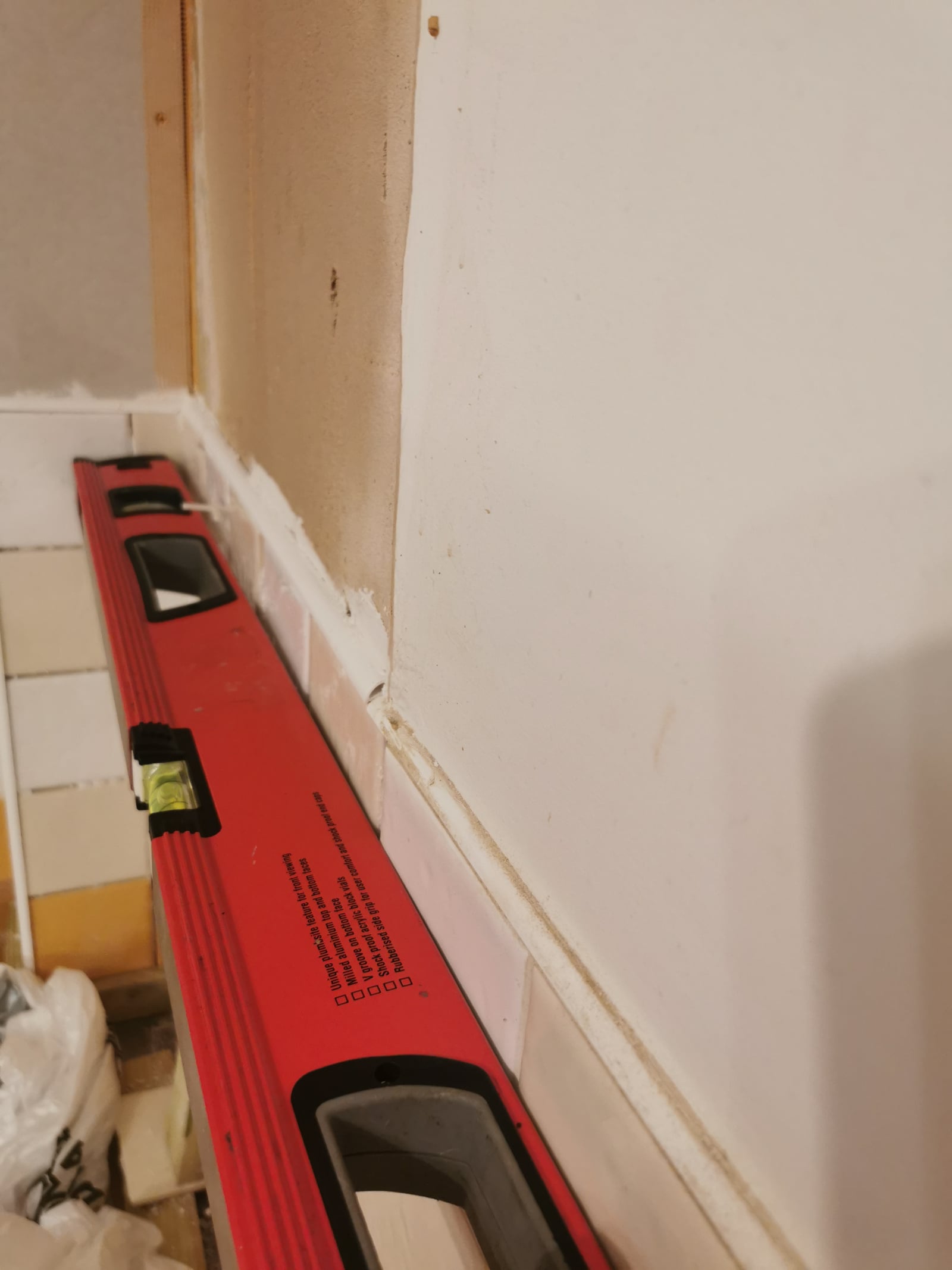 Top view. Right (white wall) is the part which has been done when we moved in. Left (freshly skimmed) is the new part. You can see how the wall is at an angle. In the corner on the left, the gap between the spirit level and the wall is ~1.2cm