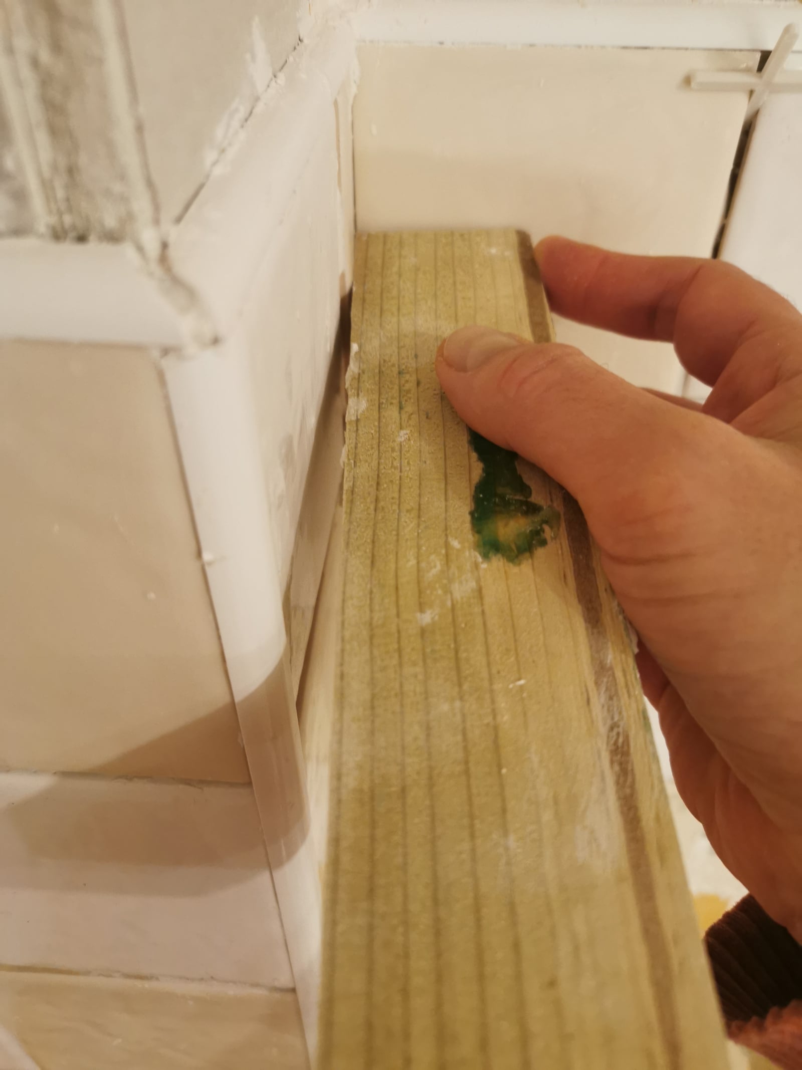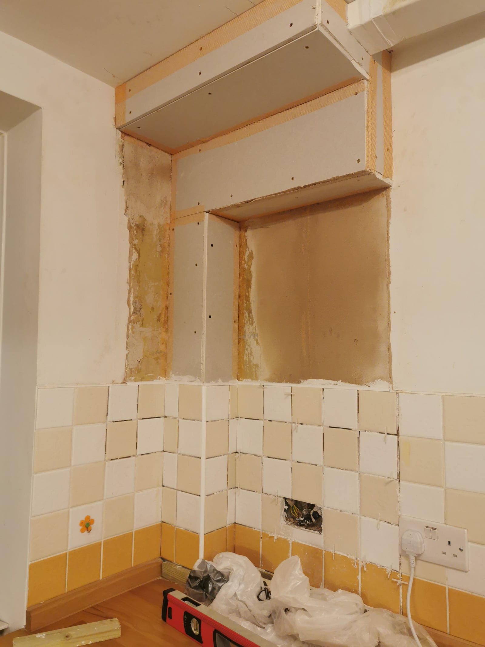 When we moved in, the area surrounding the boxed boiler was skimmed and partially tiled. Where the boiler and box was, nothing was done, so it was now still the old uneven wall (1950s house with brick walls).