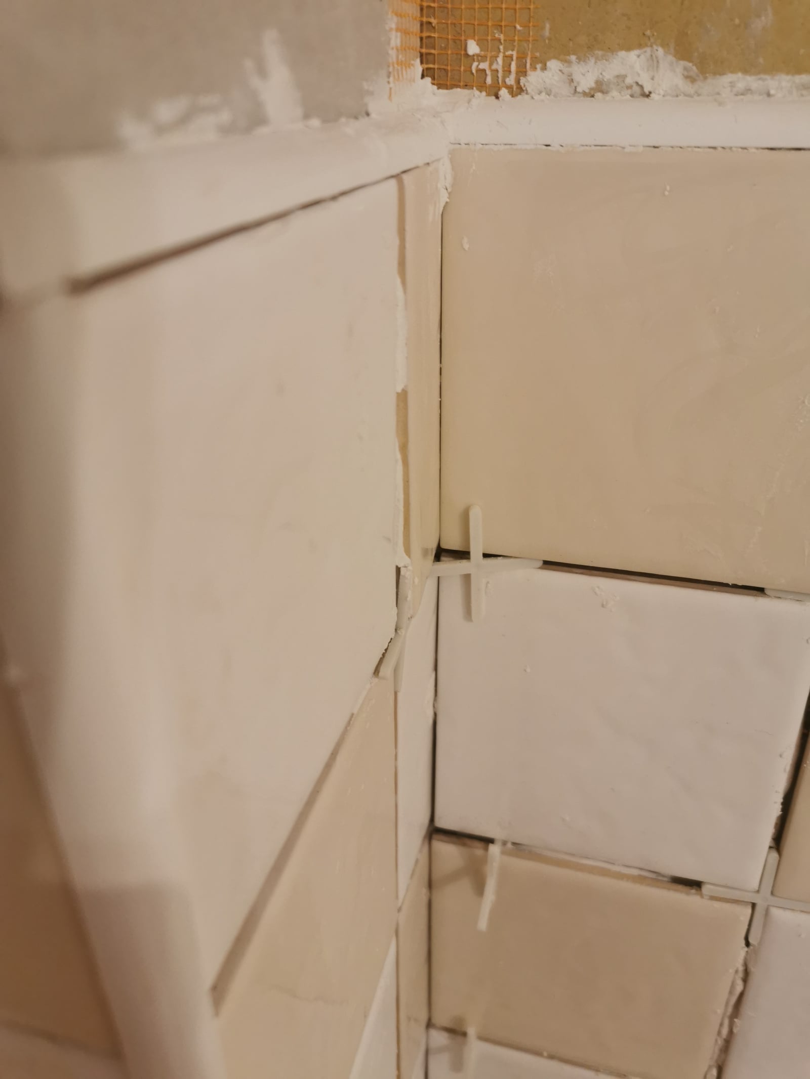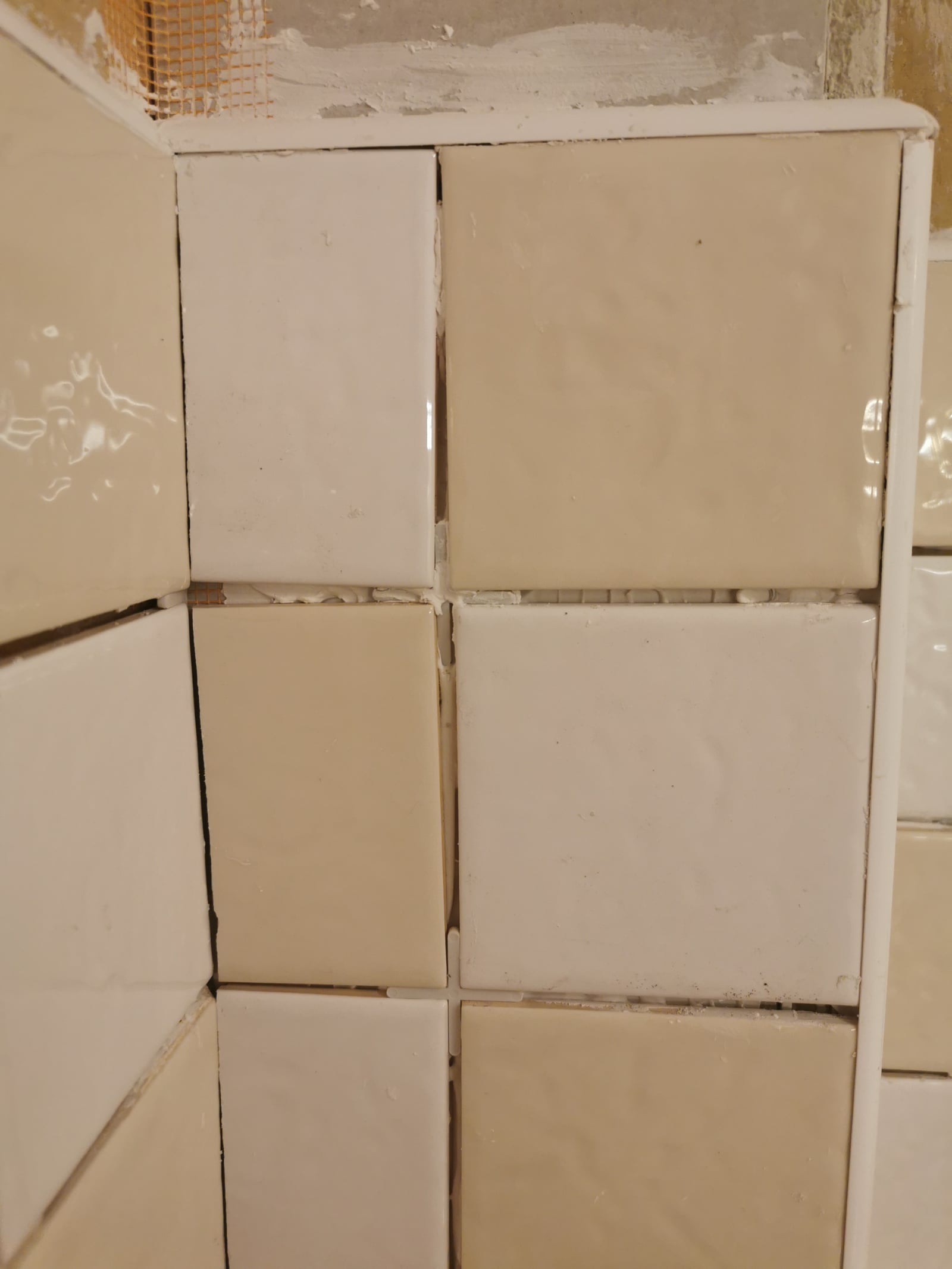 - Yes, my fault to not make a fixed price beforehand, learning from thatWe cannot comment on the whole work involved, and - yes - it is often the case that a number of small fiddly jobs take longer than seemingly much 'bigger' ones.That's one issue.The one thing we can comment on is the quality of tiling. It is not remotely good enough.How good should it be? At least as good as the original tiling.You can demonstrate unambiguously that the new tiling is of a far inferior standard. You can compare grout gaps, tiles not being positioned 'square', tiles not aligning along the top - including the trim, inaccuracy of tile trim mitres, and why the heck is some of it covered in adhesive? It's not even DIY standard - it's feeble beginner.It will look better once it's all grouted, and the slopes/differences in wall level might not even be particularly apparent, but the poor tile gapping, alignment, and trim mitres will always be obvious to you.It is unacceptable.0 -