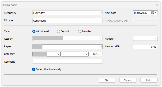 For regular amounts, you can set up a Schedule. If you tick "enter bill automatically", it adds the transaction as an actual transaction on the correct day every time you launch AceMoney. Have a play with it, it's a great functionality for all kinds of things.