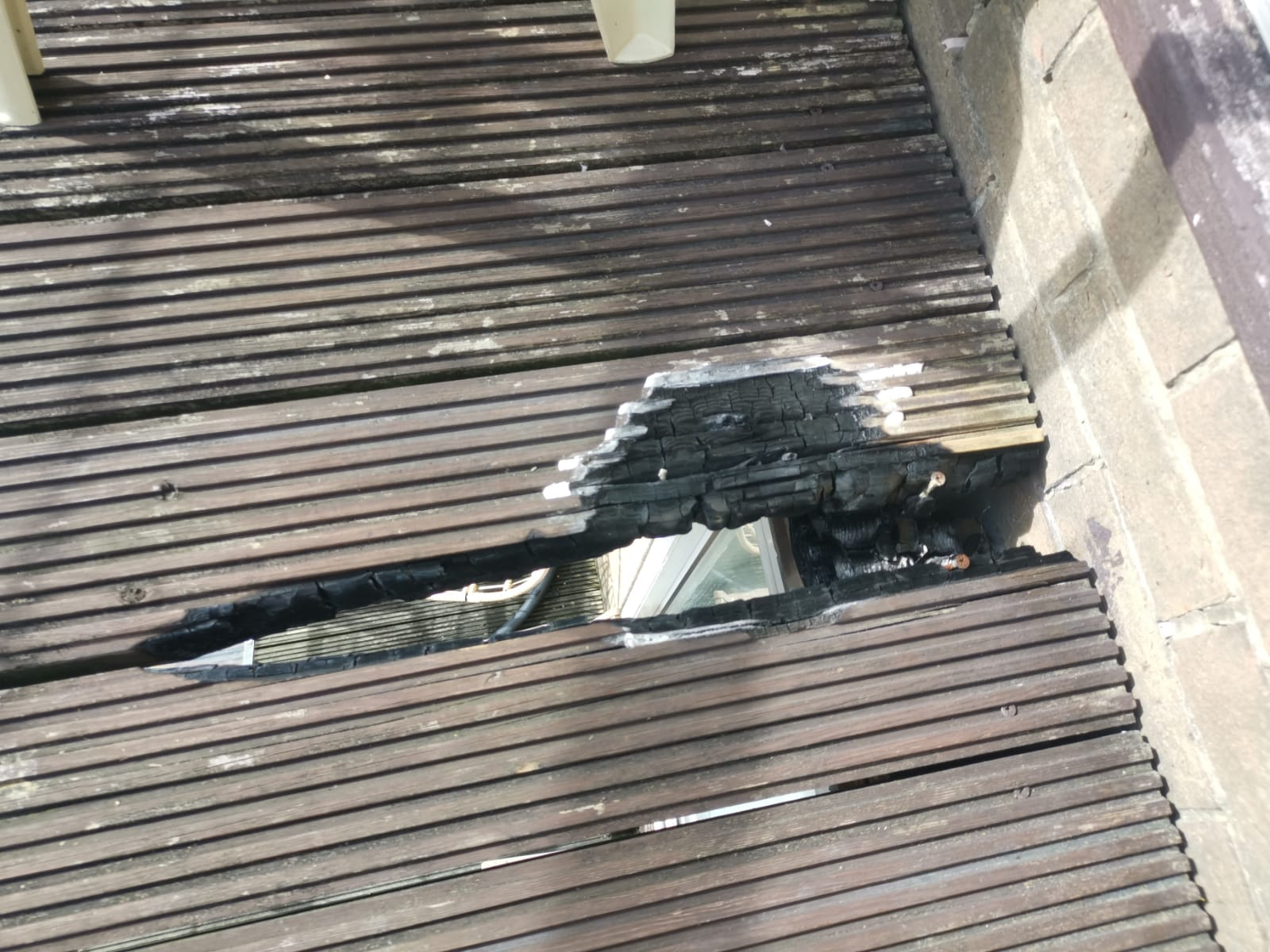 I suspect they reckon the supporting joist along that wall is also burnt and may need replacing. That would theoretically require all the decking boards to be lifted = quite a significant drop to the ground. That could be their 'justification'.