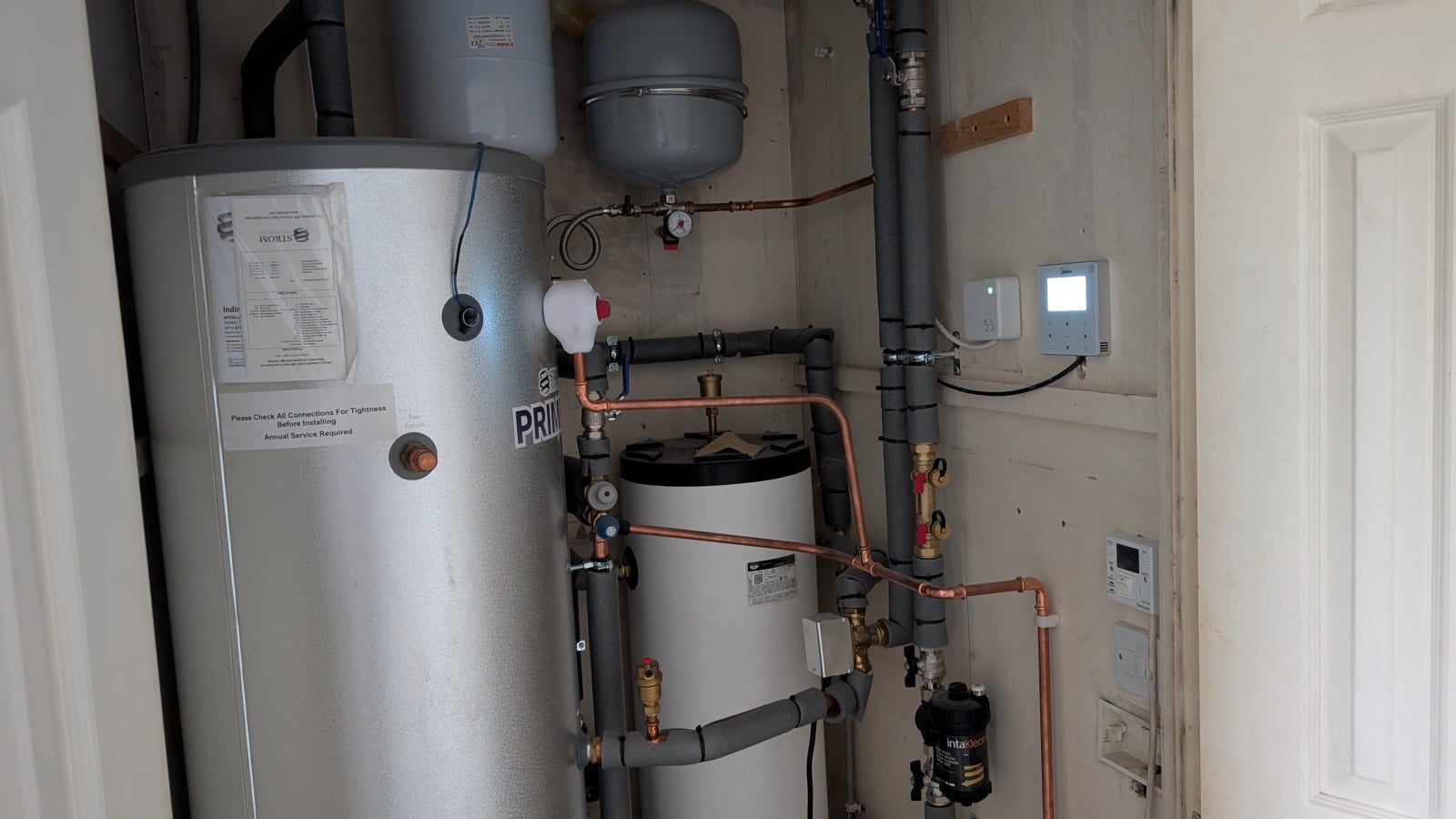 Here's the set up in the airing cupboard. The controller on lower far right is the immersion timer which is permanently off. Upper 2 boxes on right are the Hive controller and the Midea controller.