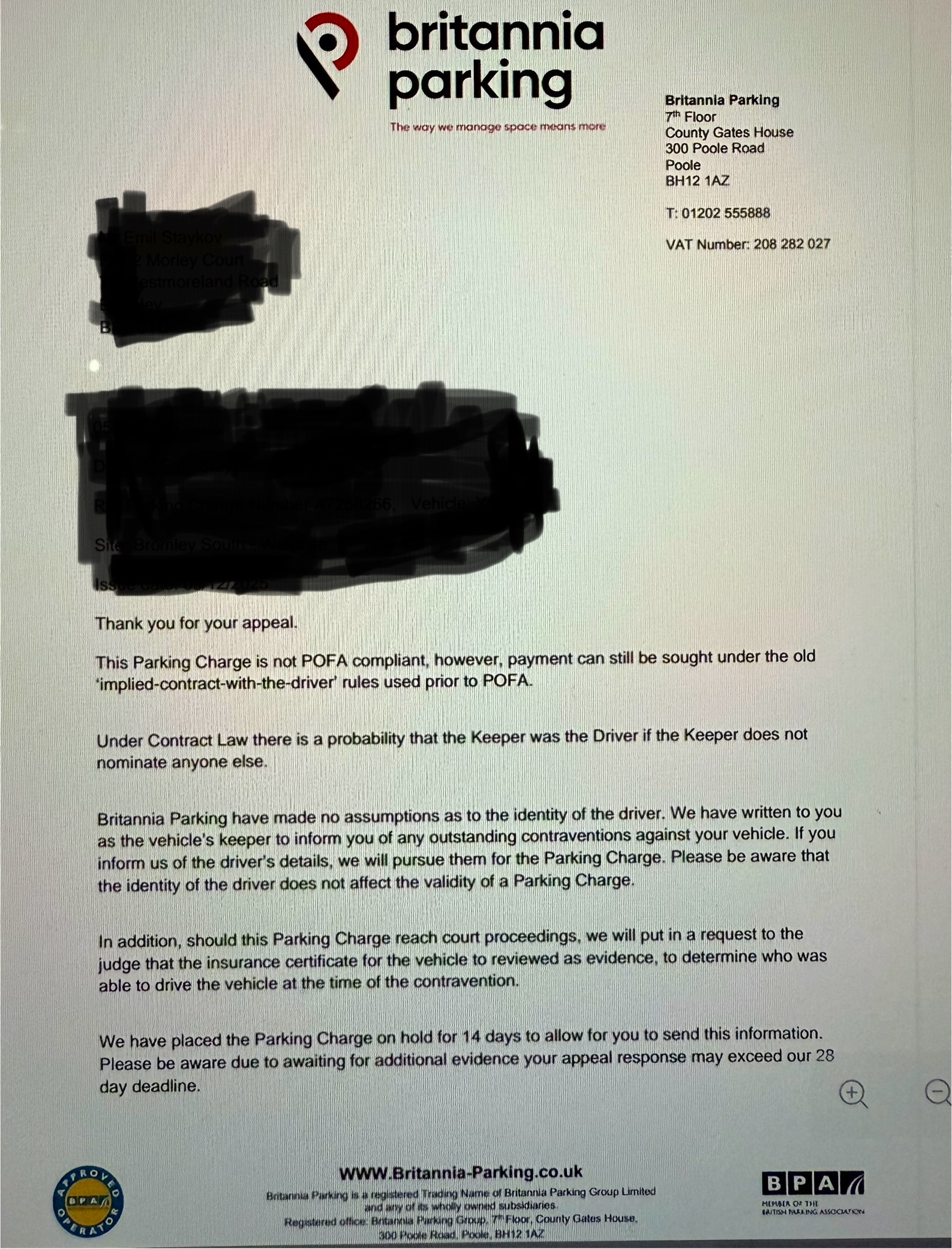Anyway, the keeper now wins at POPLA because Britannia have admitted the NTK is not POFA worded. If that is the case you will easily 100% win both at POPLA.PRIVATE 'PCN'? DON'T PAY BUT DON'T IGNORE IT (except N.Ireland).