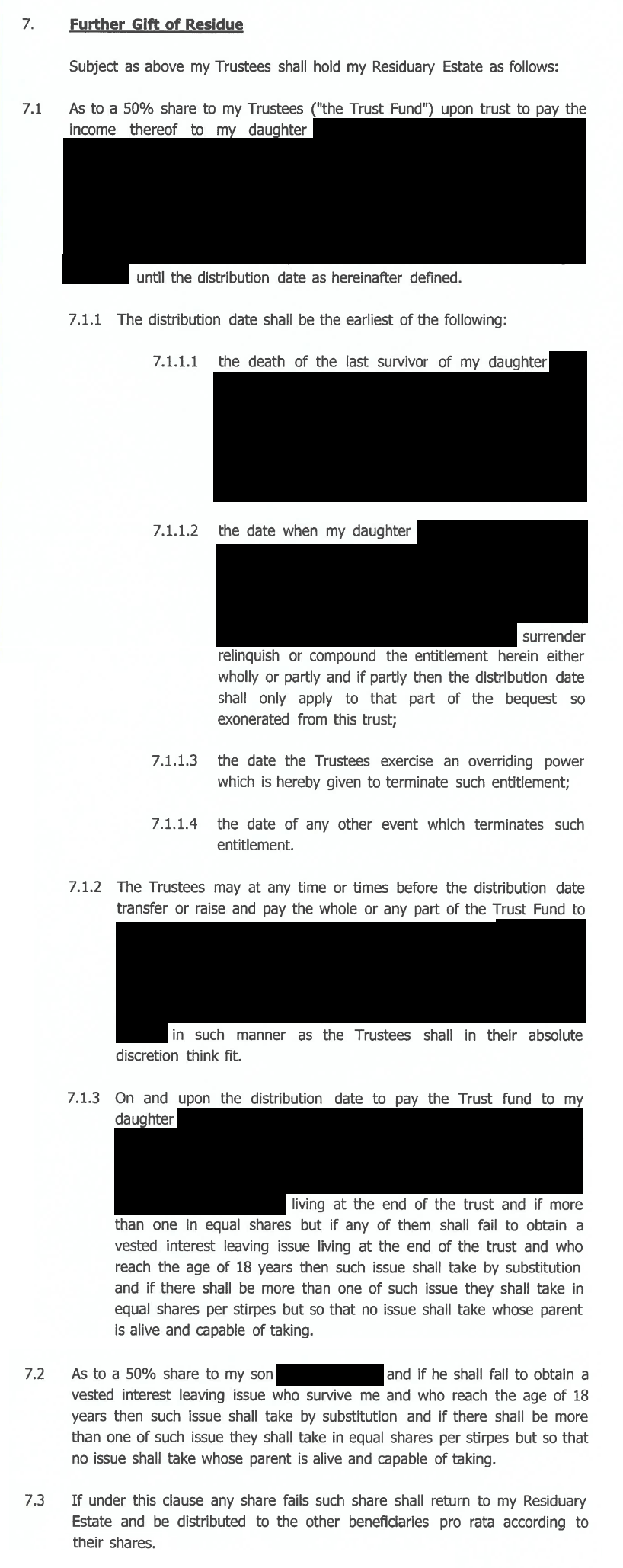 The clauses of the Will you have chosen to supply are very heavily redacted to an extent that it is not clear whether you have removed enabling trust provisions as well as beneficiaries' names.