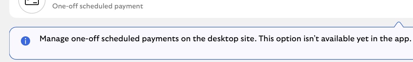I can see future payments, SOs and estimated dates for DDs. Fairly recently a, "payments leaving soon" section with up to three future payments was added in the app after you click into your account. If you click on the ">" arrow on the right of the screen in that section it takes you to a "upcoming payments screen" where you can scroll through many more.SevenOfNine said:Bit puzzled. On 2 Jan I set up a single future payment for 1 Feb. I have printed "you set up" confirmation, & it's all correct.