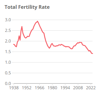 Some may argue that it's because people are living longer, which is only a very small part of it, the main problem is the declining birth rate, whereby we are now achieving new record lows every year. We have been below the net replacement rate for over 50 years.
