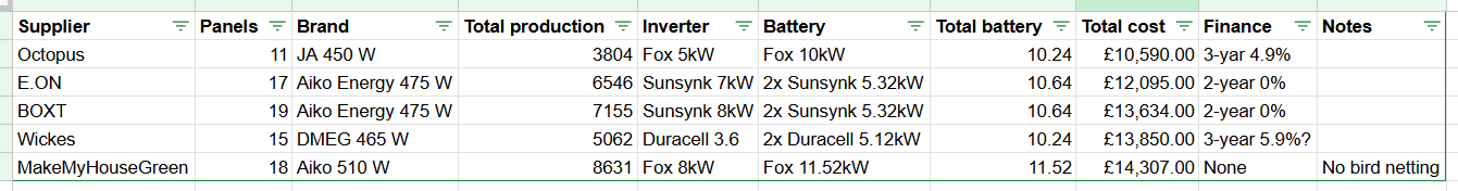 We decided to finally bite the bullet and gather a few quotes for solar panels and battery storage for our house. It's a fairly sizable 5-bedroom detached property in the South East. Current average yearly electricity consumption is about 6-7,000 kWh (we have an EV), likely to increase as we look at potentially installing a heat pump in the next 2-3 years.