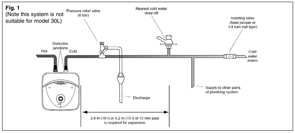 10l units usually need 3m of pipe before the first outlet (tap) and 4.5 m for a 15 l unit for expansion.