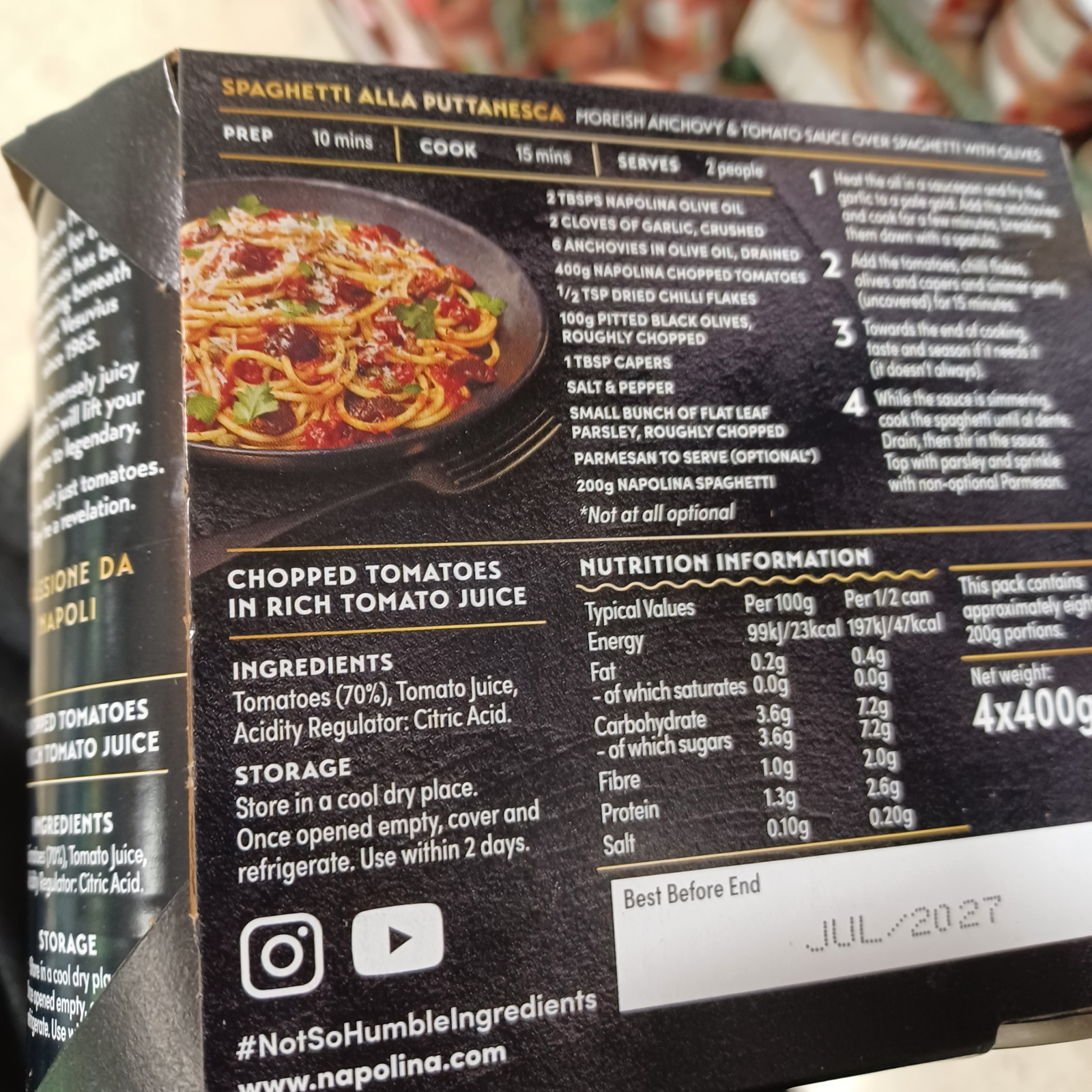 Nothing to do with Tesco as they are not made by them.bluebottle11 said:Hi,I have noticed something with Napolina tinned tomatoes in Tesco.I have purchased single cans previously, so thought I would buy the x4 pack as they were on offer with a Clubcard.However, after using one of the tins I noticed a difference in quality.When checking the ingredients, each can in the x4 pack contains 70% tomatoes compared to the individual cans that contain 99%.I believe this is deliberately misleading the customer as the cans in the 4 pack look identical to the individual cans.