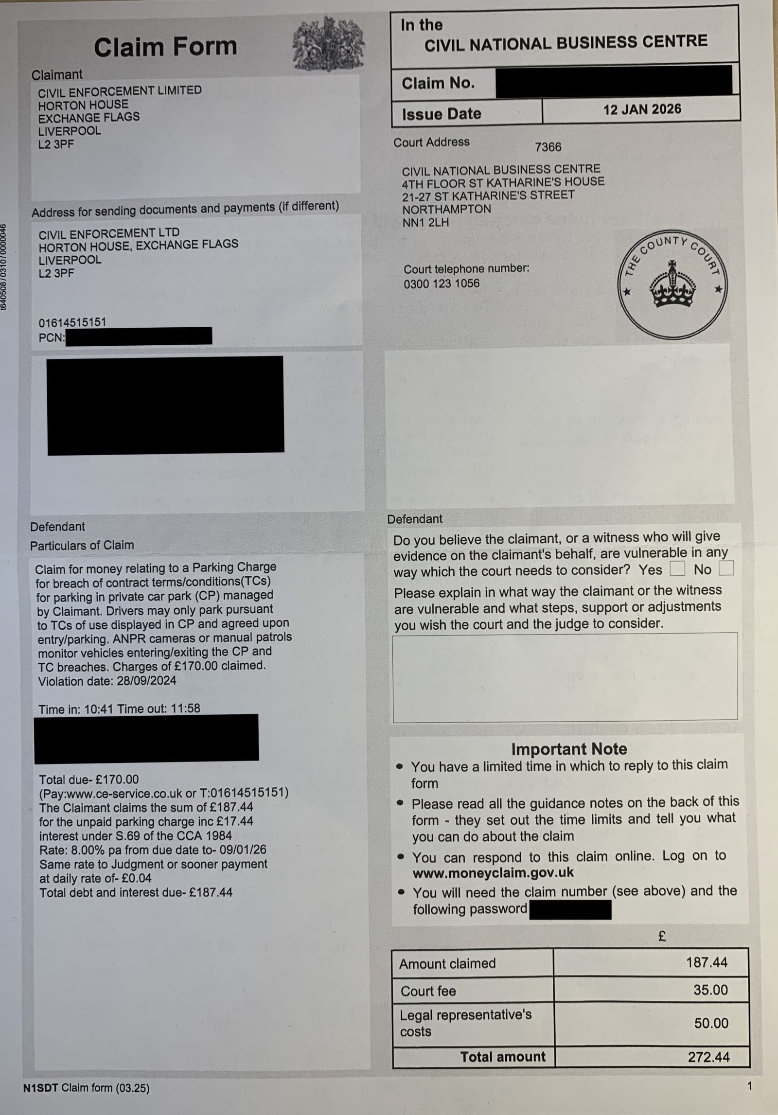 Hi there, I’ve received a claim from from civic enforcement limited, and I am hoping for some advice with the defence. Redacted claim form is attached below: