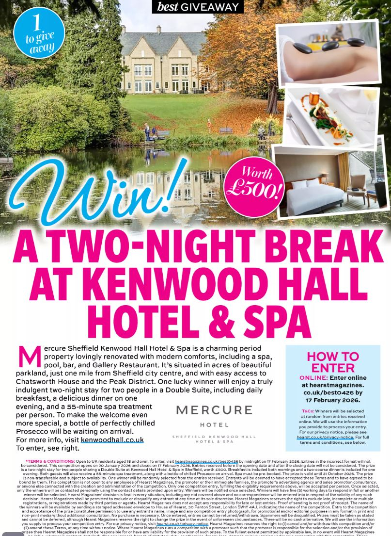 The prize is a two-night stay for two people sharing a Double Suite at Kenwood Hall Hotel & Spa in Sheffield, worth £500. Breakfast is included both mornings and a two-course dinner is included for one evening. Both guests will also receive a 55-minute spa treatment, along with a bottle of chilled Prosecco on arrival. Spa must be pre-booked. The prize is valid until 31 October 2026. The prize is non-transferable and subject to availability