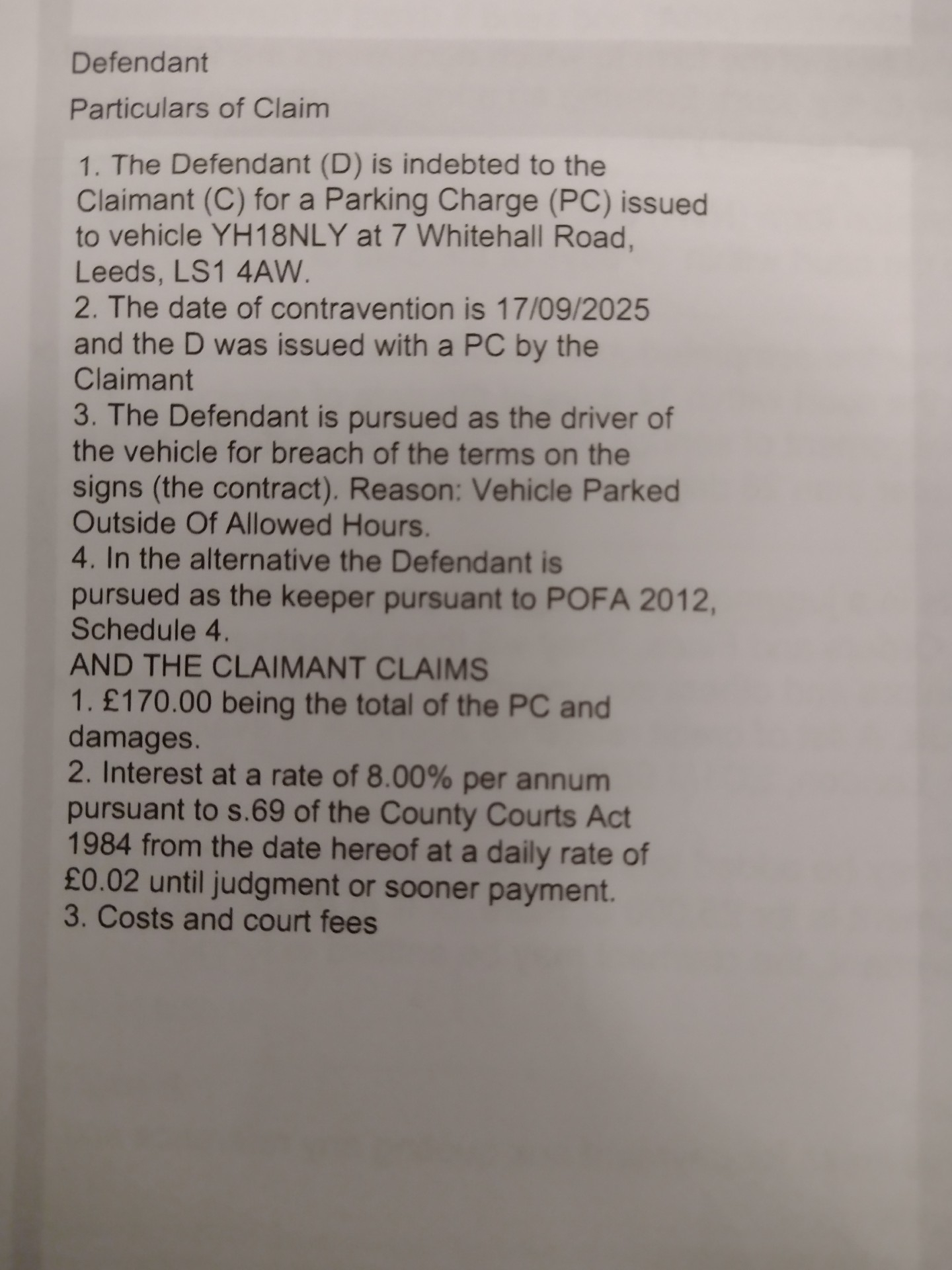 3. Referring to the POC: paragraph 1 is denied. The Defendant is not indebted to the Claimant. Paragraph 2 is denied. The Defendant does not accept that a contravention occurred on 17/09/2025, as alleged. Whilst the Defendant is the registered keeper, paragraphs 3 and 4 are denied. The Defendant is not liable and has seen no evidence of a breach of prominent terms. The quantum is hugely exaggerated (no PCN can be £170 on private land) and there were no damages incurred whatsoever.