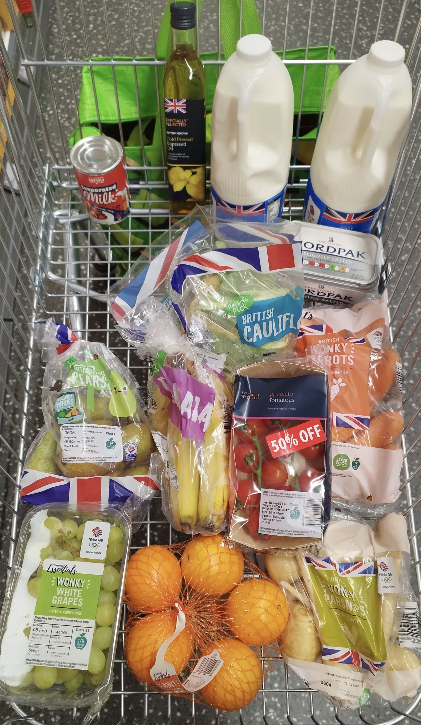 £47.77 spent already, including on some store cupboard things (cornflour, stock cubes, tea bags) and some very nice but not cheap sea bass. Otherwise all the usual staples plus parmesan.