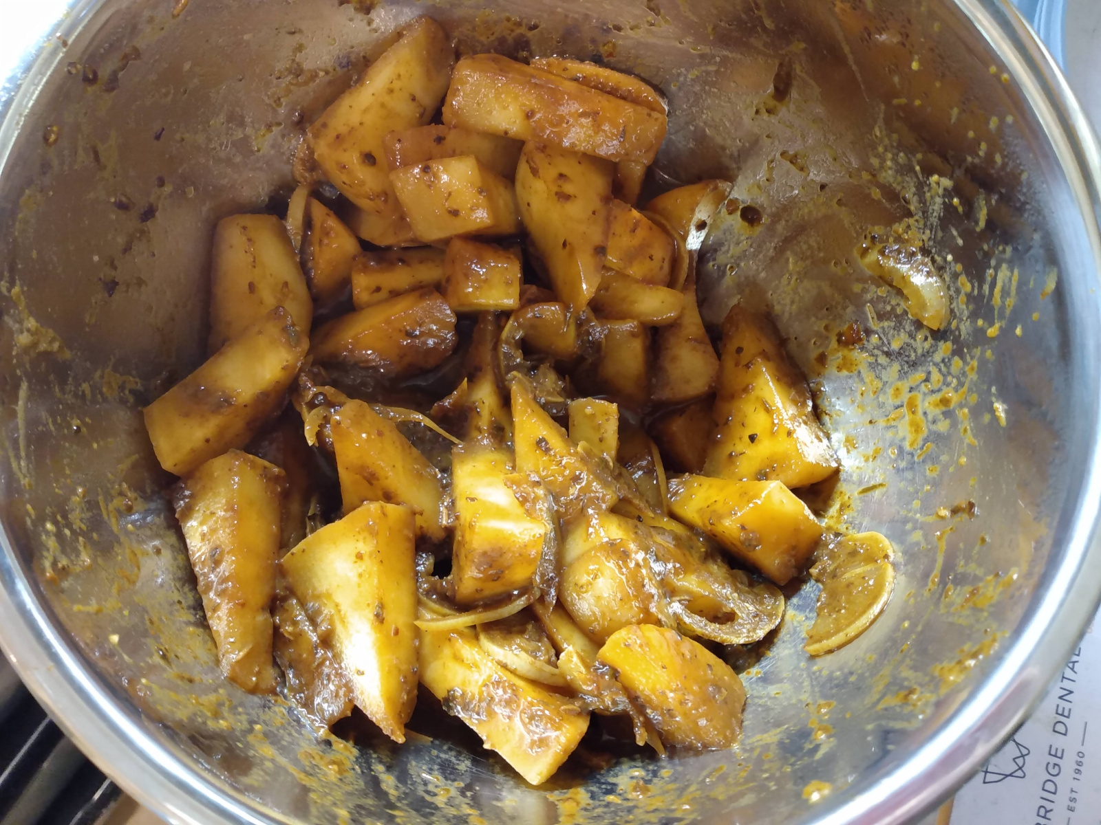 I looked for a recipe to use the turnip I bought yesterday and found this Ottolenghi Spicy Turnip one for which I had all the other ingredients apart from the fresh coriander leaves so I made a half quantity of it this afternoon while it was raining. I decided to peel my turnip because the skin wasn't very attractive and then I cut it into 6 wedges before blanching it and then chopping it into the 1cm pieces which worked well. Here's the end result which is very tasty but a bit runny. I really like the spicy paste but I'm not so sure about the turnip but it may grow on me. I'm proudest of the fact that I resisted the temptation to pop to the shop for some fresh coriander so I'm claiming my first no-spend day. Hip Hip Hooray. 😇😁