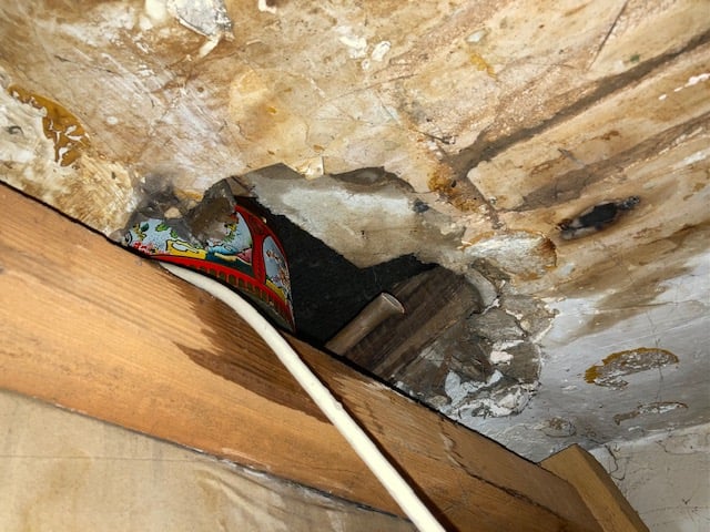 Over the past few months we've started noticing some leakage during periods of heavy rainfall, in an in-built cupboard in the rear back addition which also houses the boiler. We brought a roofer in to investigate, who had a look at the roof itself with a drone and concluded it must be an issue with the felt underlayment. Repairing this would require scaffolding and therefore cost thousands of pounds, and as it only happened during heavy rainfall we decided to make do by putting a bucket underneath for the time being. We thought we might be able to wait it out until we had other jobs that required scaffolding and do them all in one go.