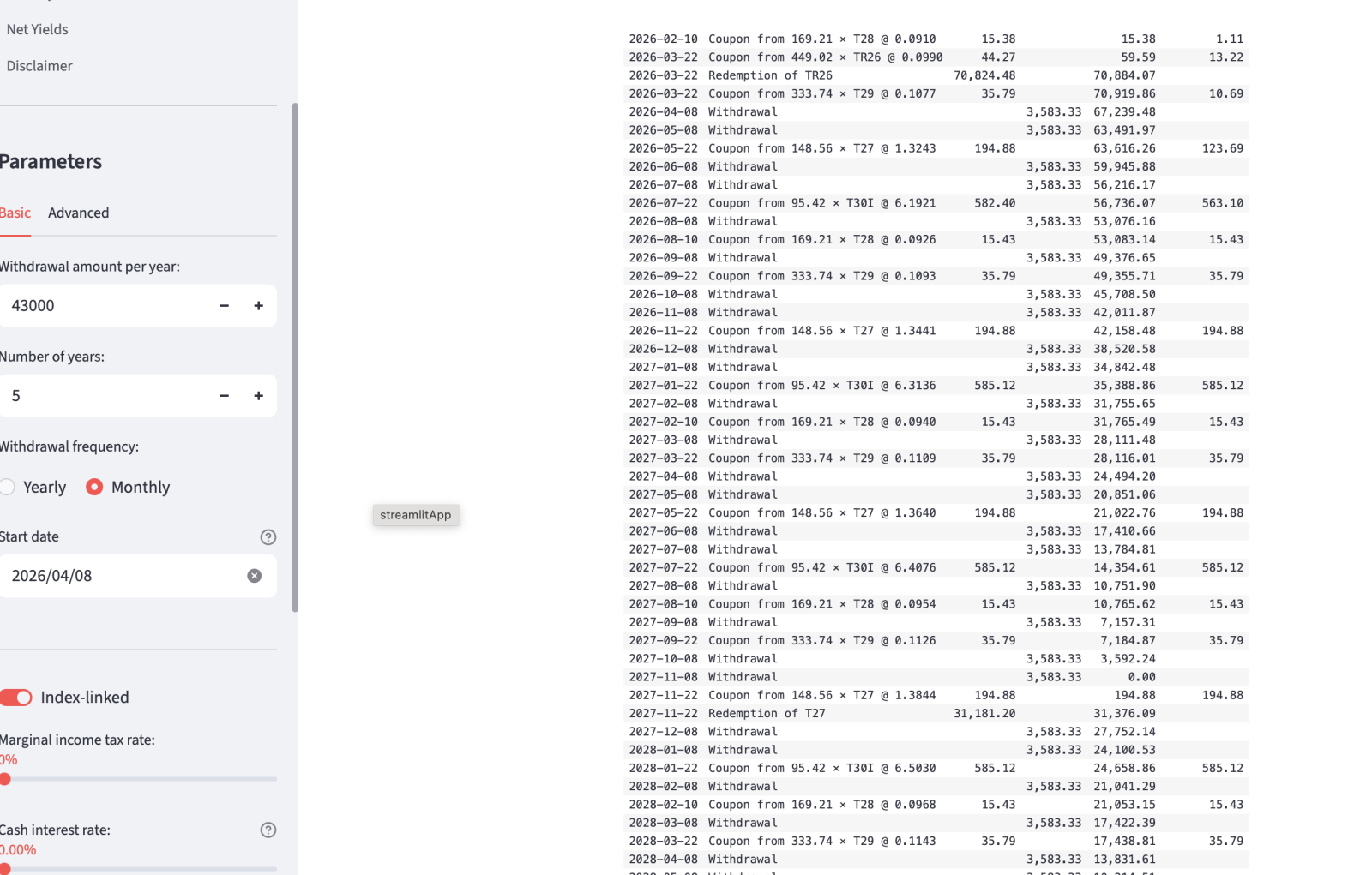 Yes that's the site I have had a play with . I like the set and forget idea of a gilt ladder , May or may not get less in long run but it's the certainty I like. I will also have a bit invested also. Needing income from April the five year gilt ladder I built had one maturing in march and 90k sitting in sipp . I aim to withdraw 43k a year Just below higher income tax rate for Scotland.