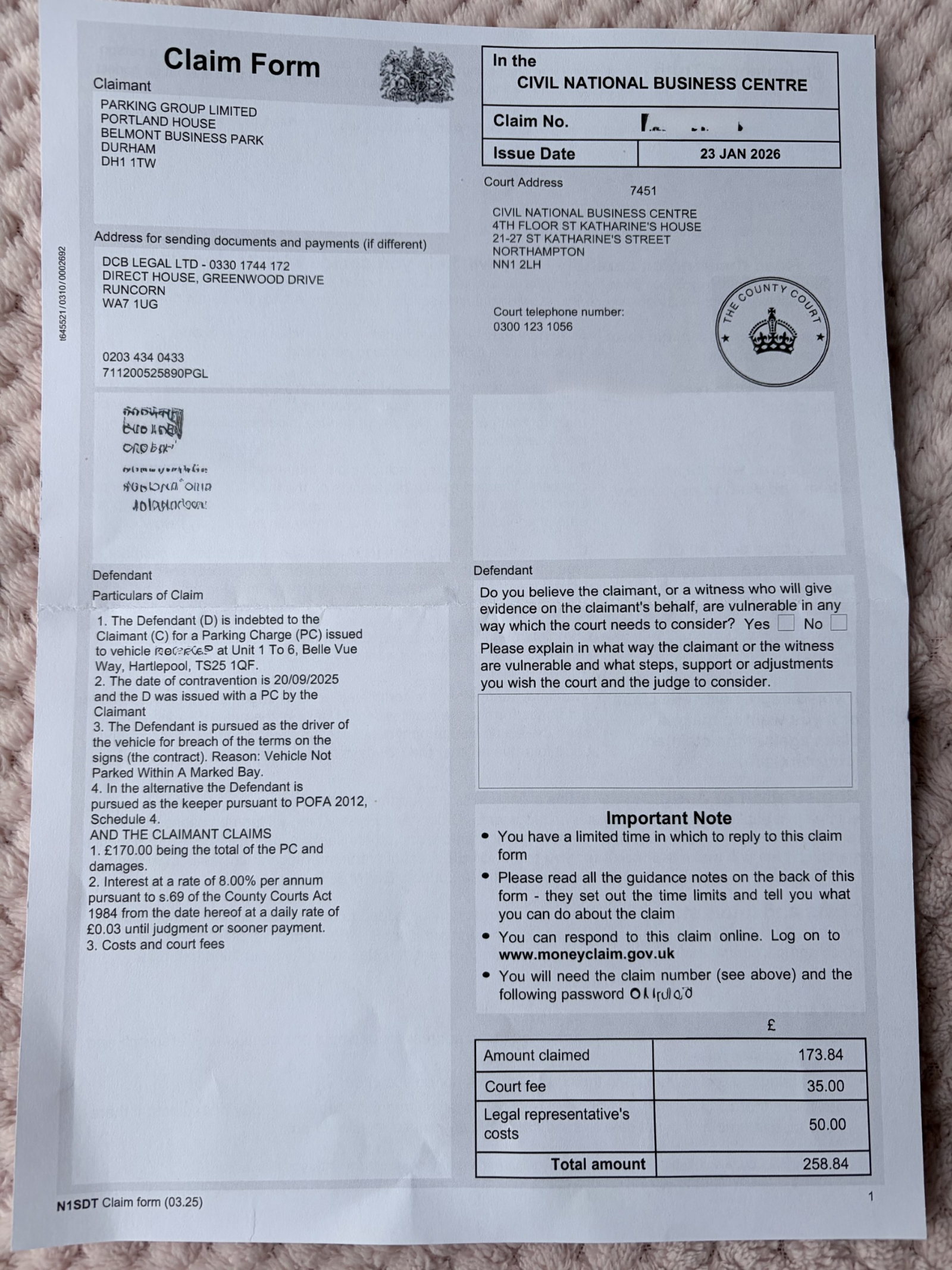 Defended claim - Parking Group Limited / DCB Legal