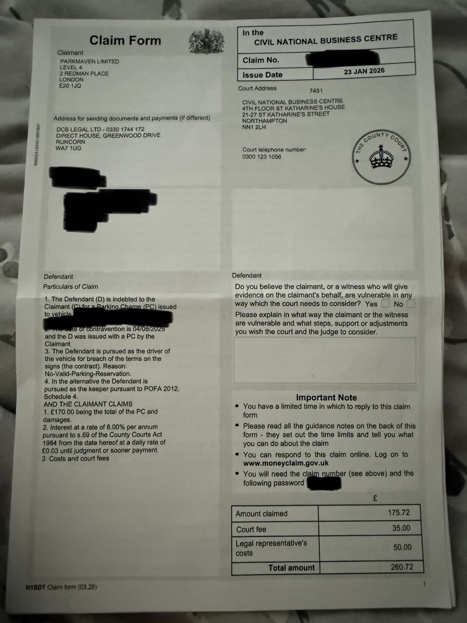 - The claim is from Smart Parkmaven Limited, via DCB Legal Ltd.