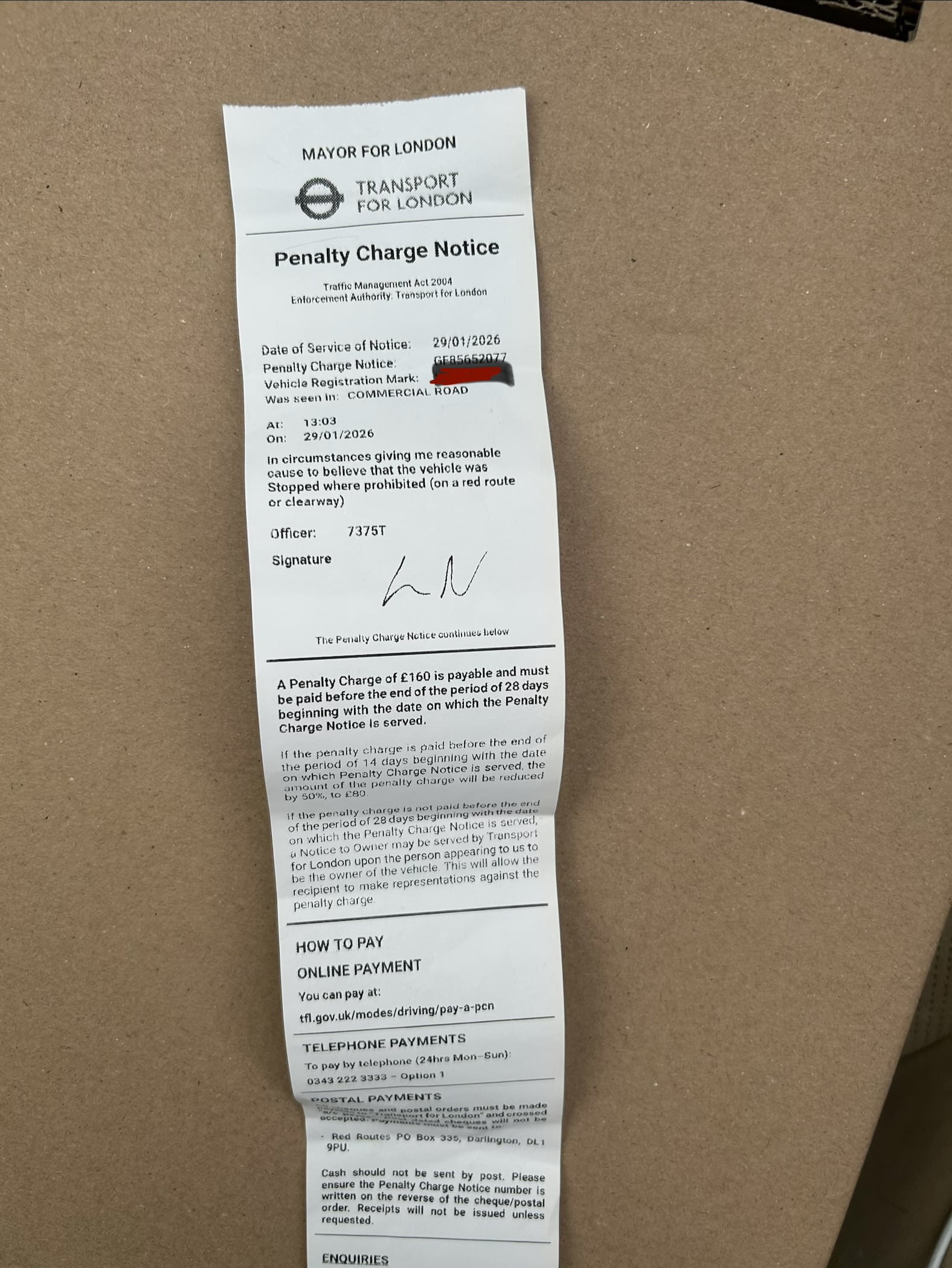 it’s a TfL pcn for a red route. Apparently they don’t have to put a pcn on dash or hand it to you. It’s sent automatically to the home. It was a police officer who did it.